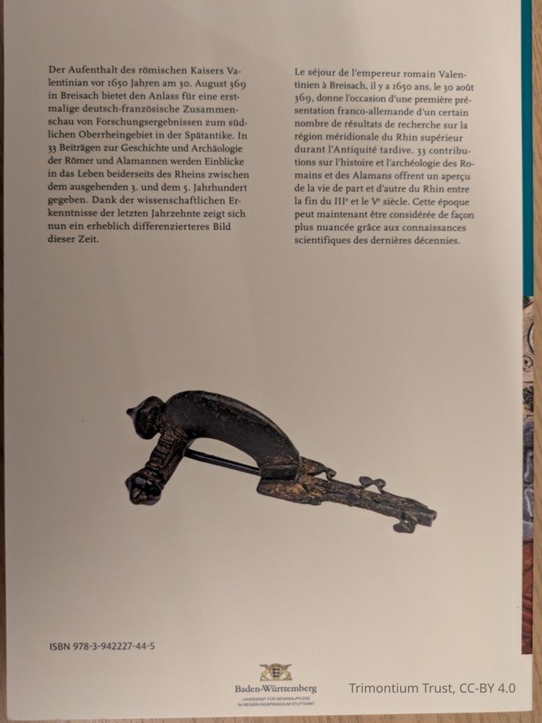 Am anderen Flussufer - Sur L'autre rive (On the Other Side of the River) is part of the Archäologische Informationen aus Baden-Württemberg series of publications. The 1650th anniversary of the Roman Emperor Valentinian's visit to Breisach on August 30, AD 369, provides the occasion for the first-ever German-French compilation of research findings on the southern Upper Rhine region in Late Antiquity. Thirty-three essays on the history and archaeology of the Romans and Alamanni offer insights into life on both sides of the Rhine between the late 3rd and 5th centuries AD.