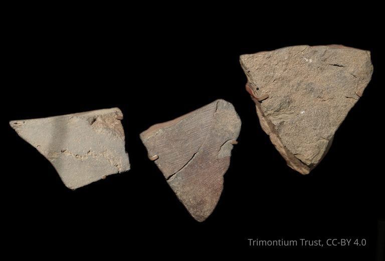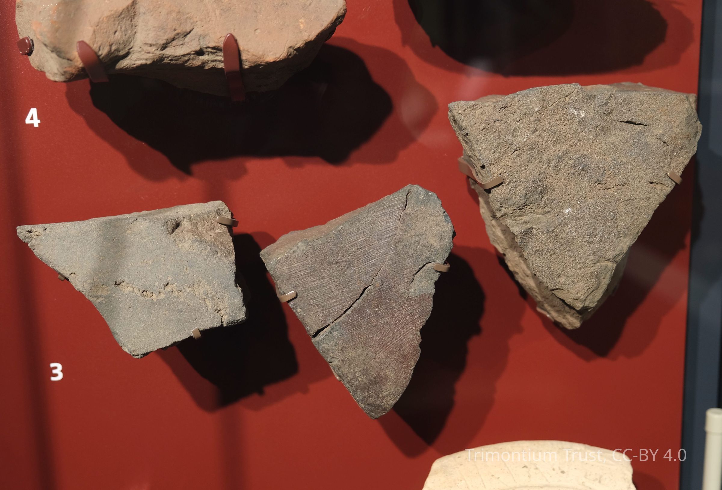 Metalworking and pottery took place in workshops in the fort’s annexes. Pottery damaged in the kiln (known as ‘wasters’) was thrown away. This discarded spout is from a mortarium, used for grinding food into sauces and paste. Mortaria were made at Trimontium and stamped by the maker. One piece here shows a name abbreviated to EMI.