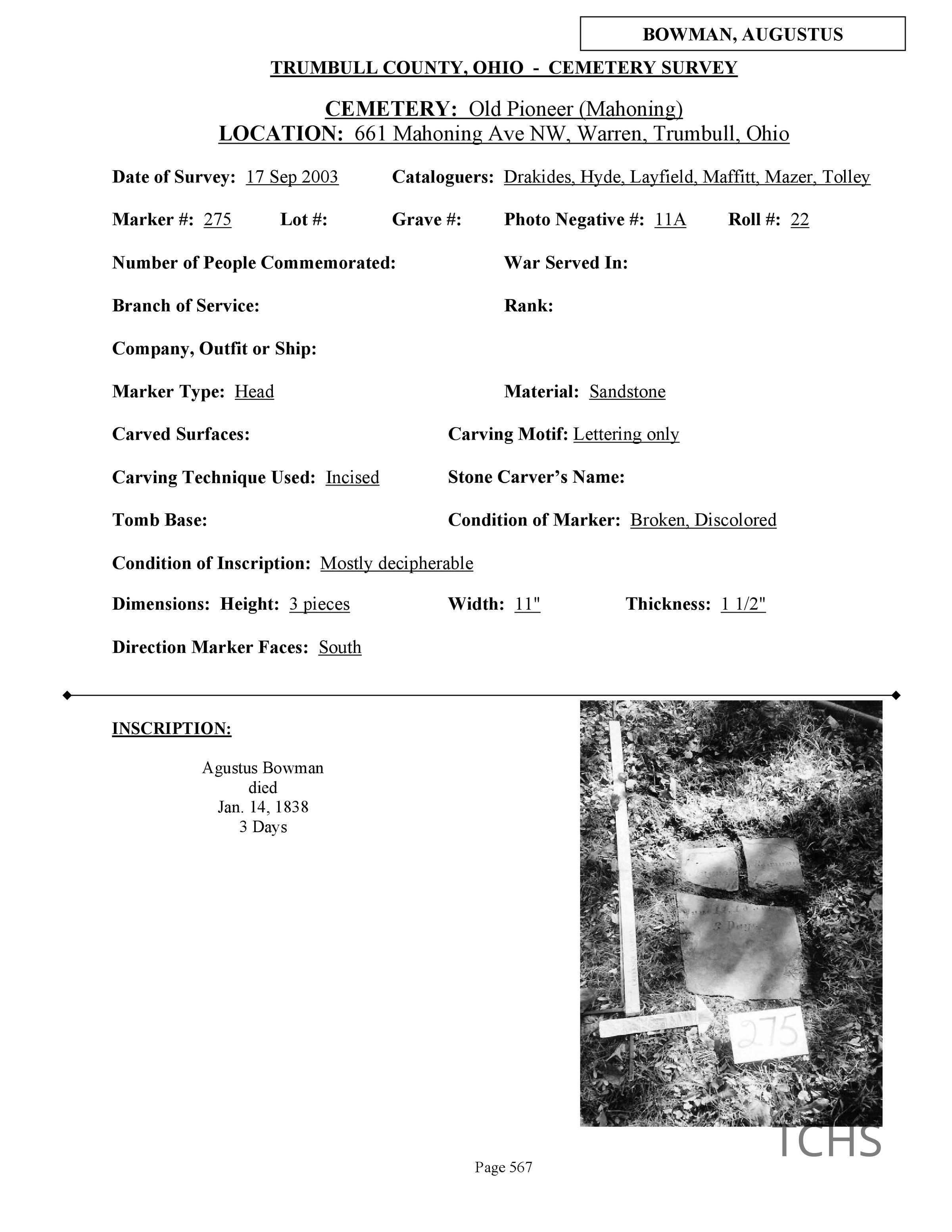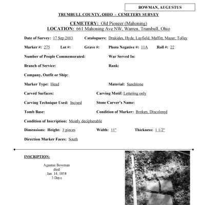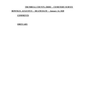 Augustus Bowman died January 14, 1838 at the age of 3 days and is buried at the Old Mahoning (Pioneer) Cemetery.