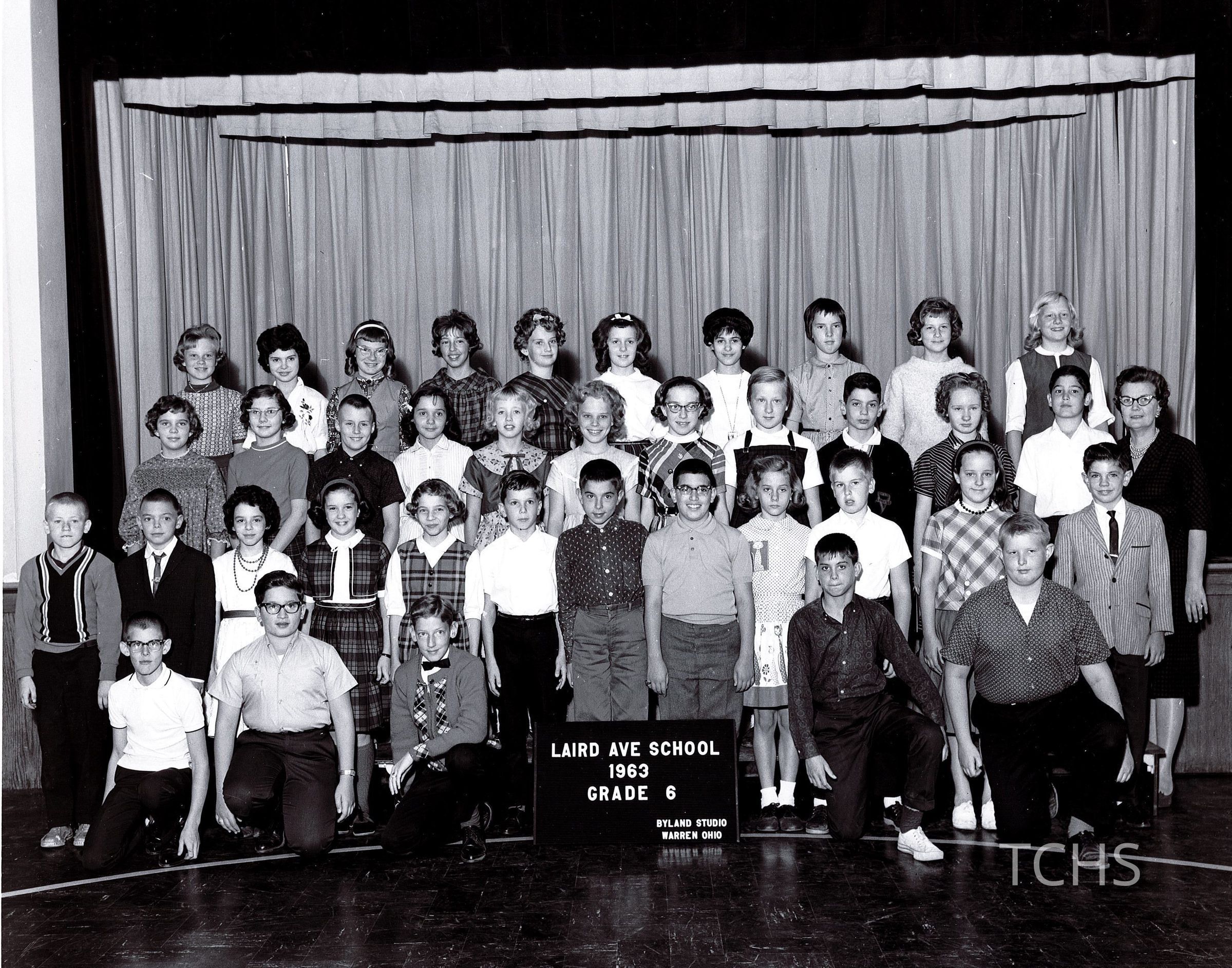 Laird Avenue Elementary 1963 Grade 6 class photo. Teacher pictured alongside students.Collection