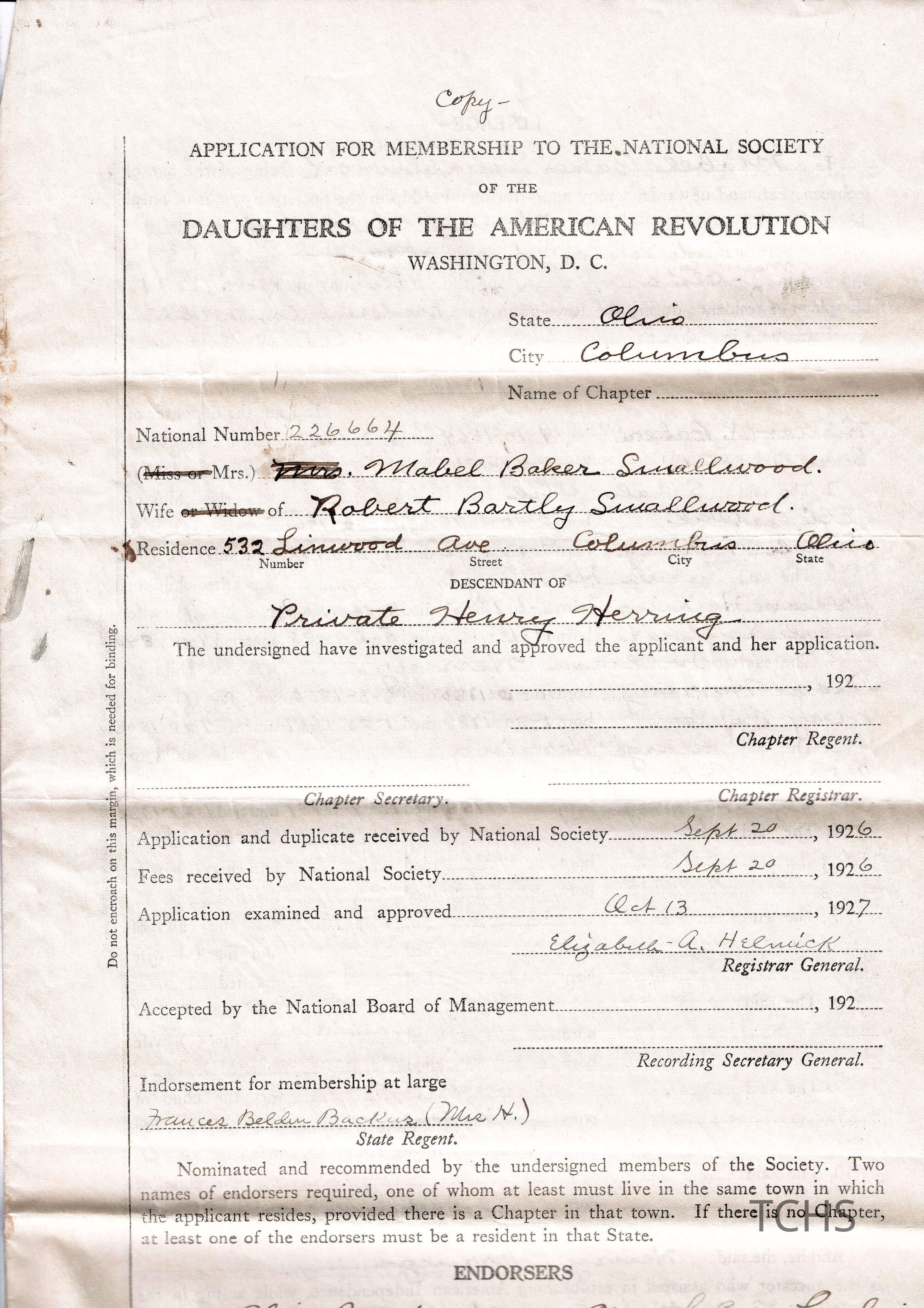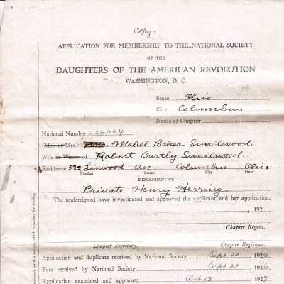 Daughters of the American Revolution application for Mabel Baker Smallwood, 1927Acquisition