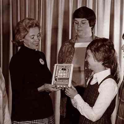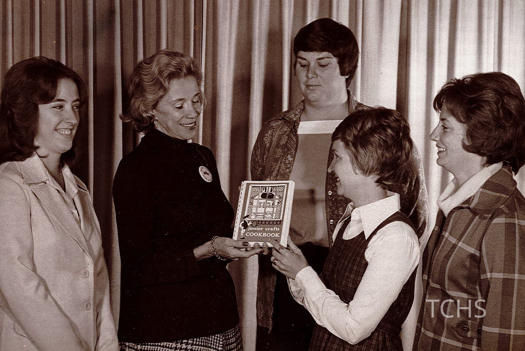 Junior Crafts Cookbook 1st copy, undated Left to right: Mrs. William Ranck, Mrs. Zell Draz, assistant to vice president of Tribune Chronicle; Mrs. John Budd, president; Mrs. Kenneth Jacobson, cookbook chair; Mrs. James Finley