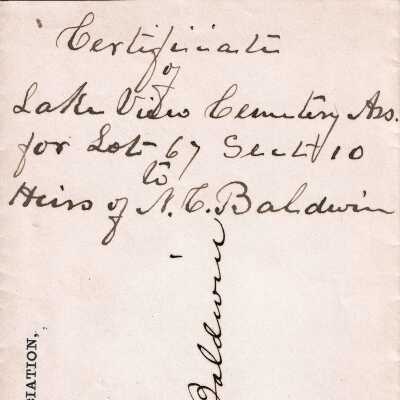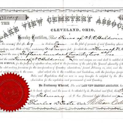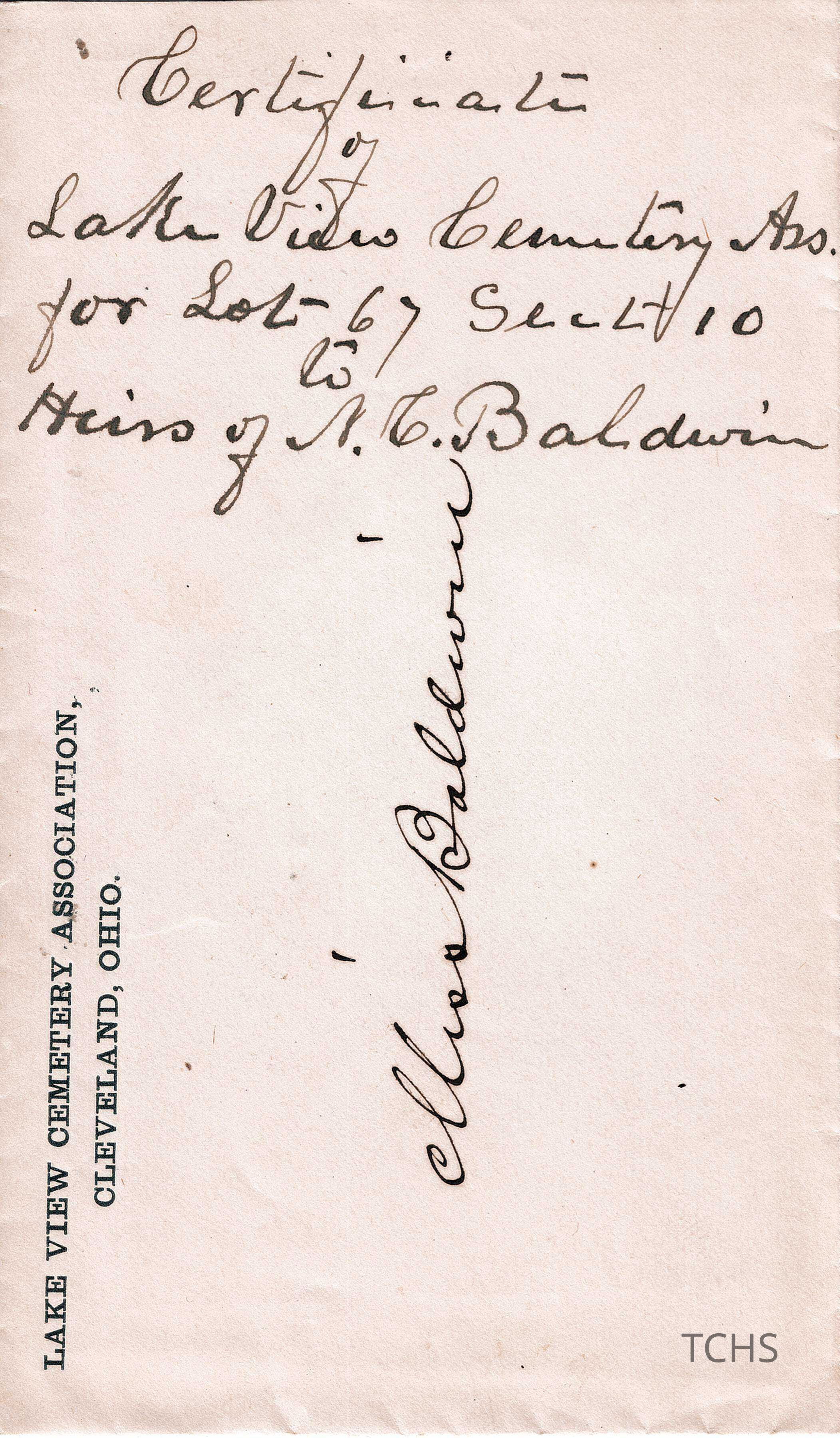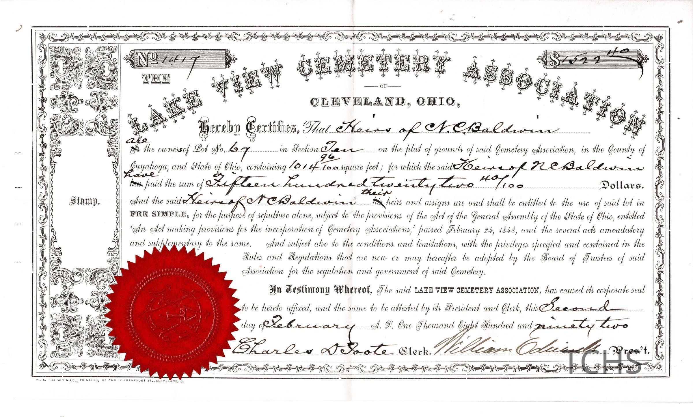Certificate, Lake View Cemetery Association, to the heirs of Norman C. Baldwin.Acquisition