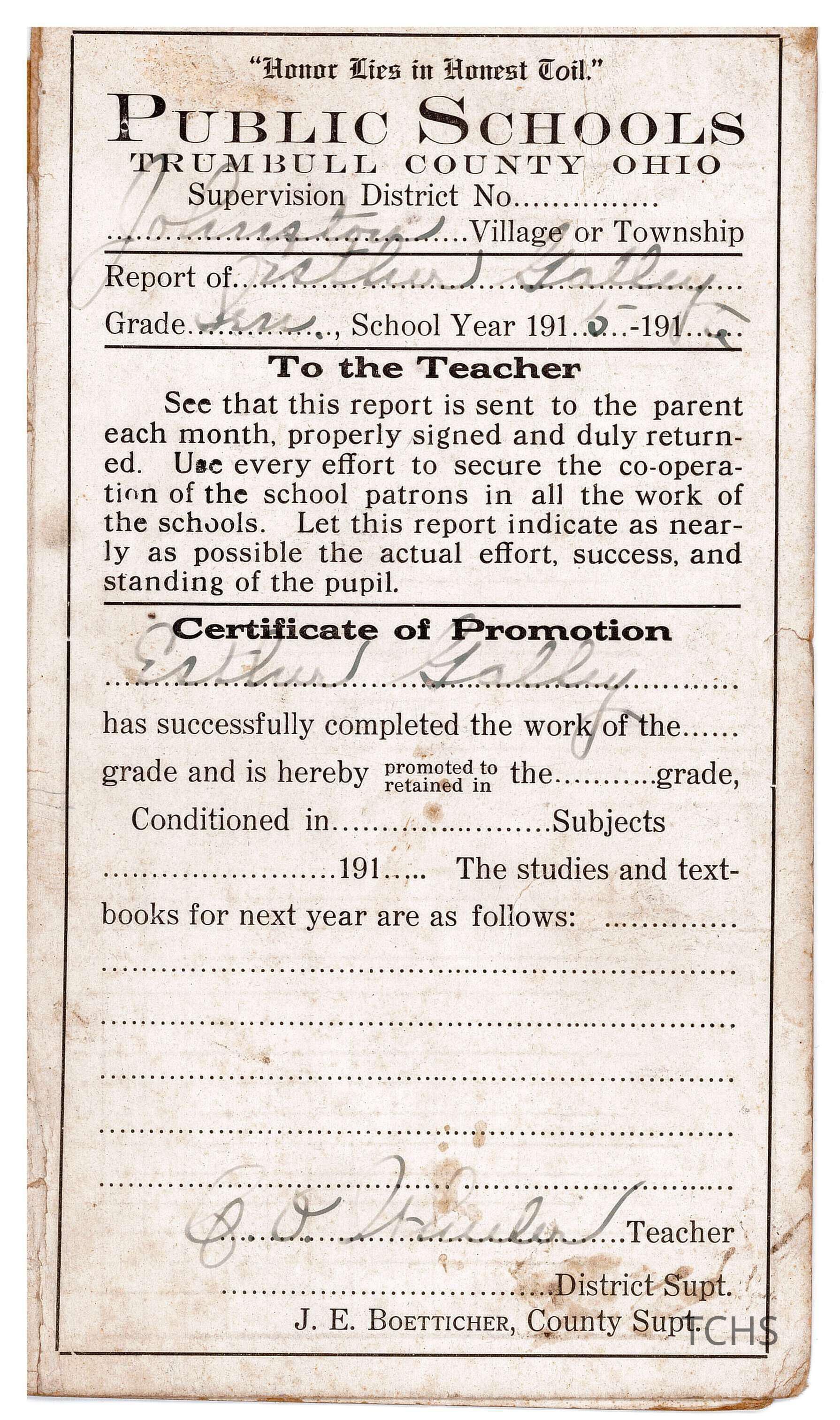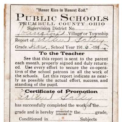 Johnstown Township school report cards for Esther Galley, signed by her parents.