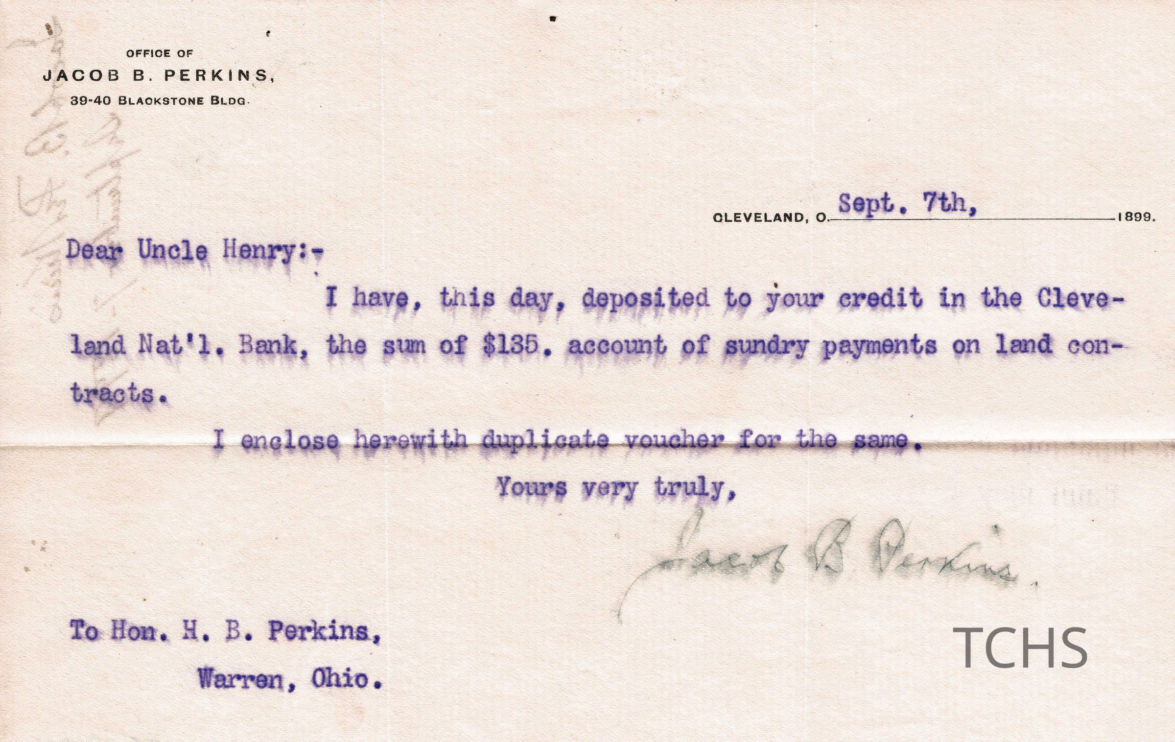 Letter, Sep 7, 1899, From Jacob B. Perkins to Uncle Henry Bishop Perkins regarding funds deposited to H.B.P.Acquisition