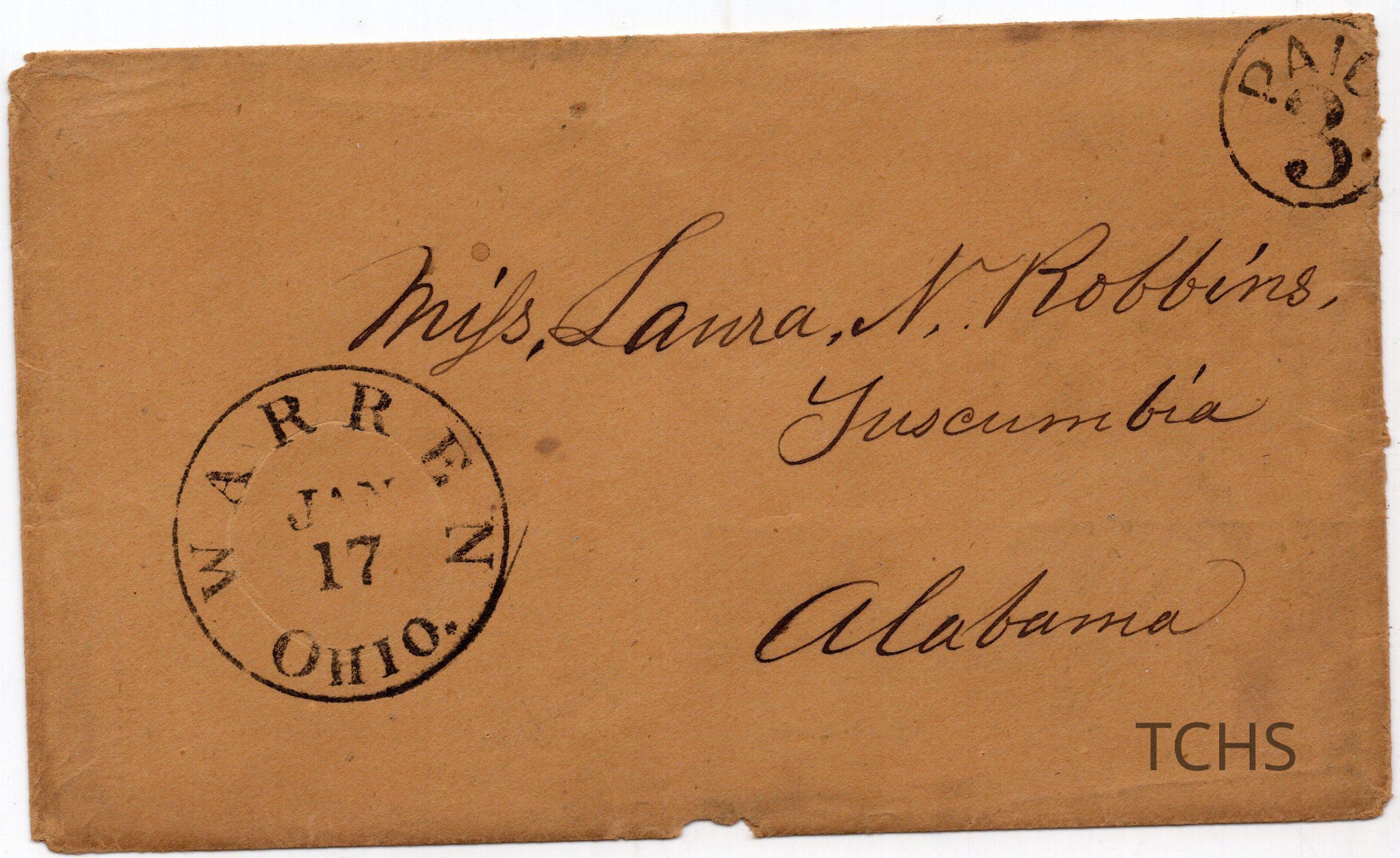 Envelope addressed to Miss Laura N. Robbins of Tuscumbia, Alabama. Stamped Warren and "PAID 3". Dated 1851 by donor.Collection