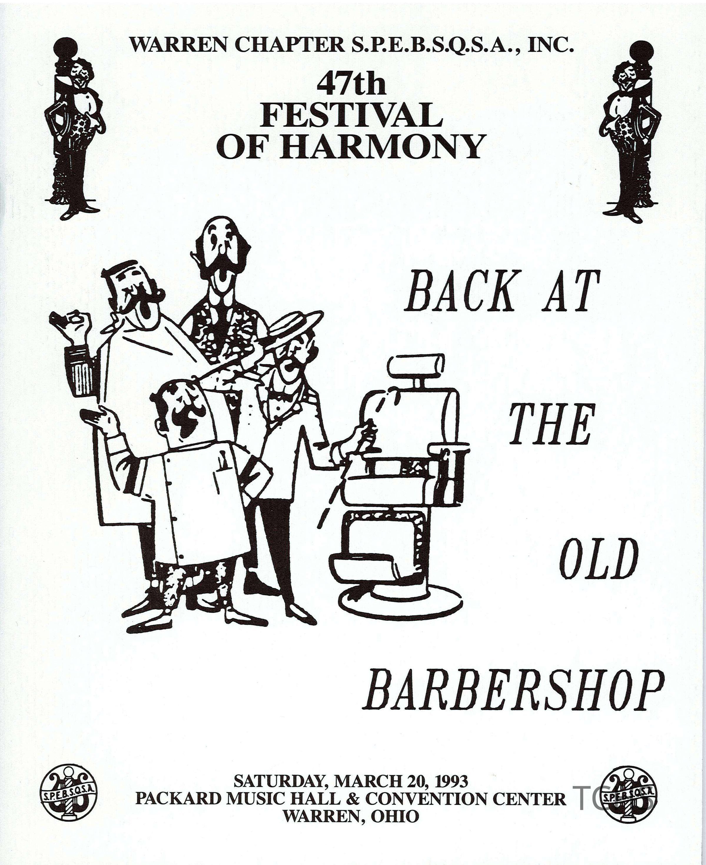 Festival of Harmony program, hosted by the Steven Foster Chorus, the Warren chapter of the SPEBSQSA (The Barbershop Harmony Society, legally and historically named the Society for the Preservation and Encouragement of Barber Shop Quartet Singing in America, Inc.)Acquisition