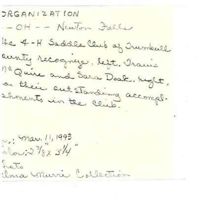 "The 4-H Saddle Club of Trumbull County recognize, left, Travis McQuire and Sara Deak, right, for their outstanding accomplishments in the club."