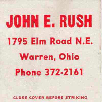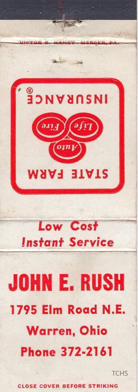 An undated matchbook of John E. Rush with State Farm Insurance, located at 1795 Elm Road N.E., Warren, OH.Acquisition