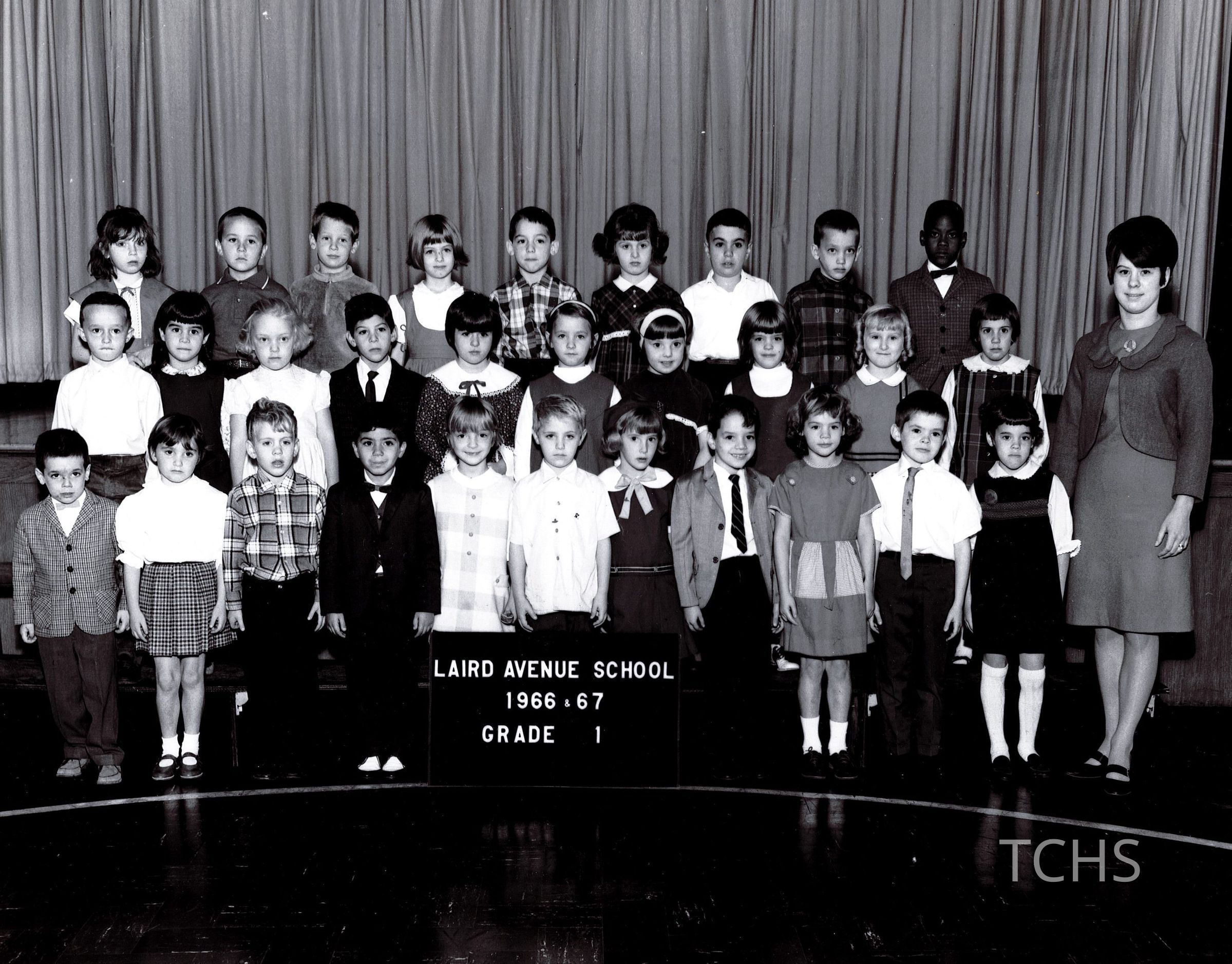 Laird Avenue Elementary 1966-67 Grade 1 class photo. Teacher pictured alongside students.Collection