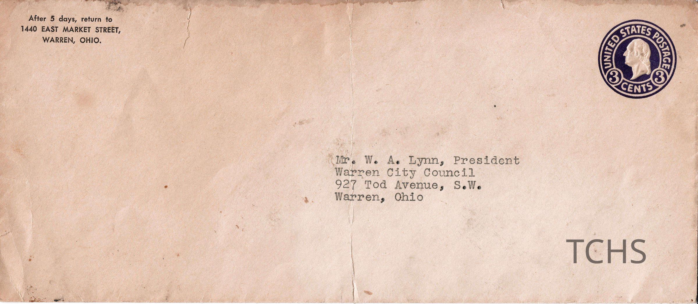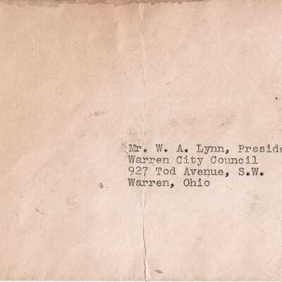 Envelope to Mr. W.A. Lynn, President Warren City Council, Undated.