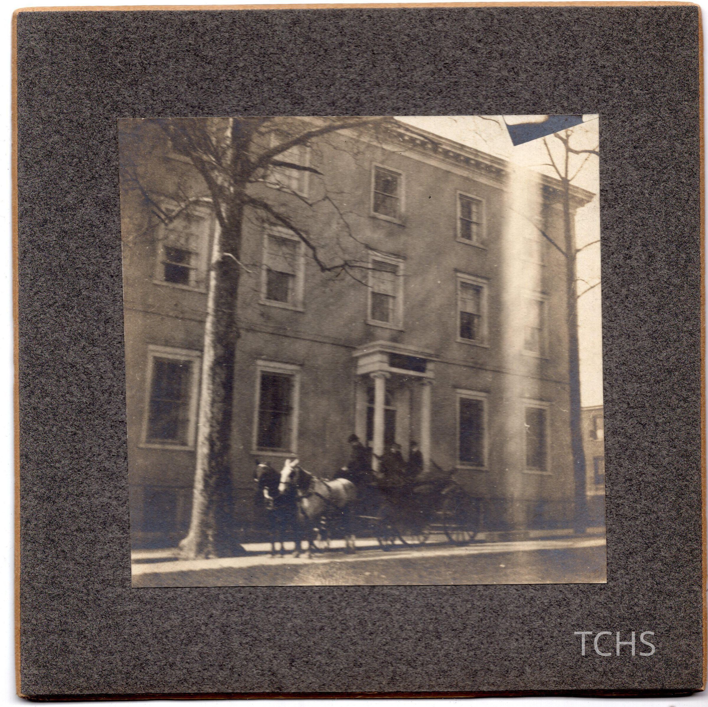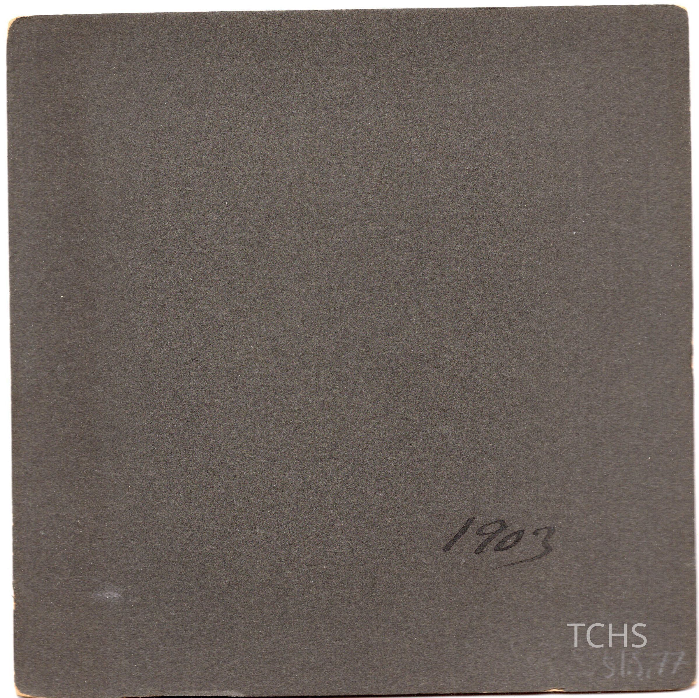 Image of a carriage pulled by two horses. People in carriage with large home behind them. Handwritten "1903”.