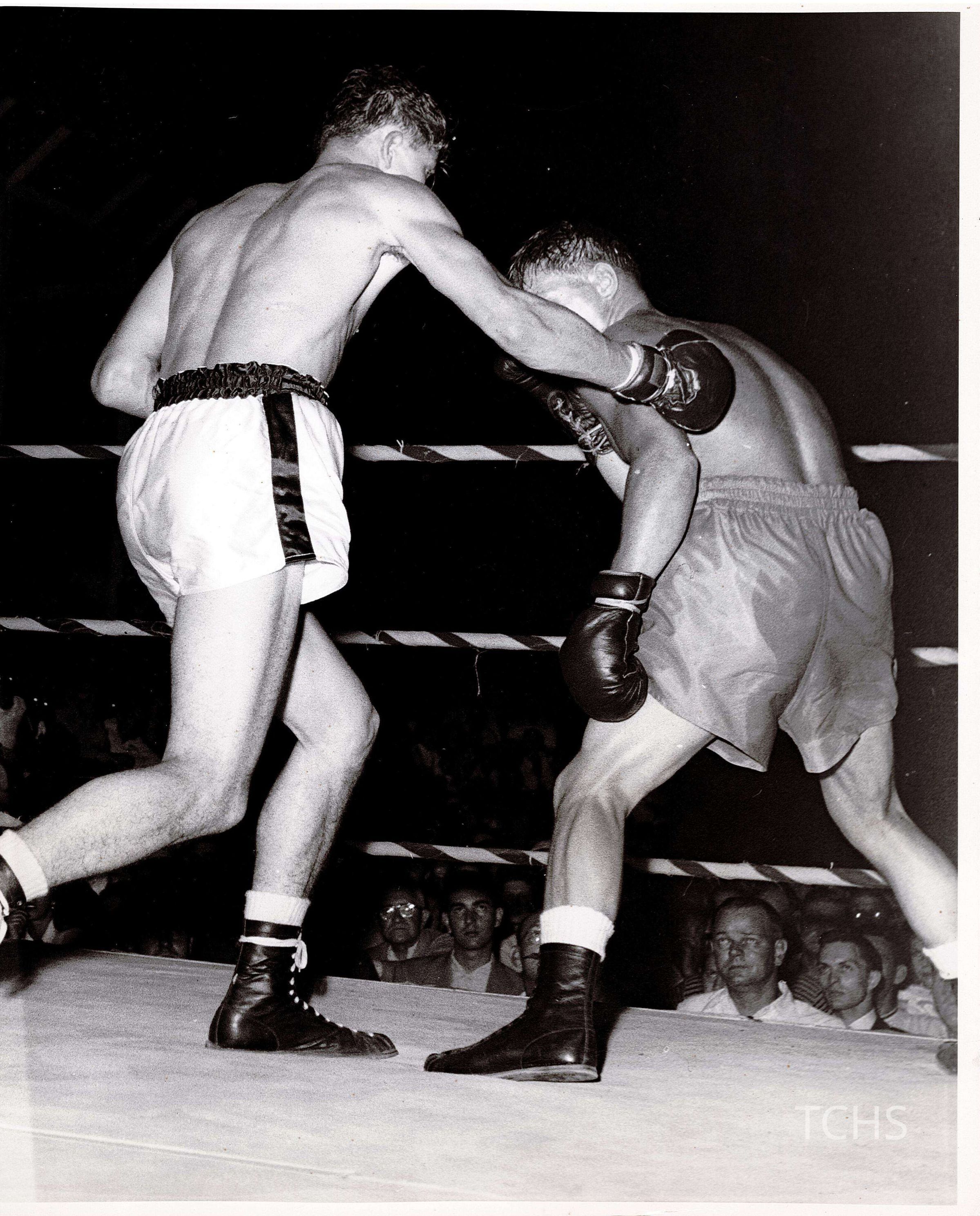Photograph a boxing match, 1950s. Boxers Sabotin and Horne.