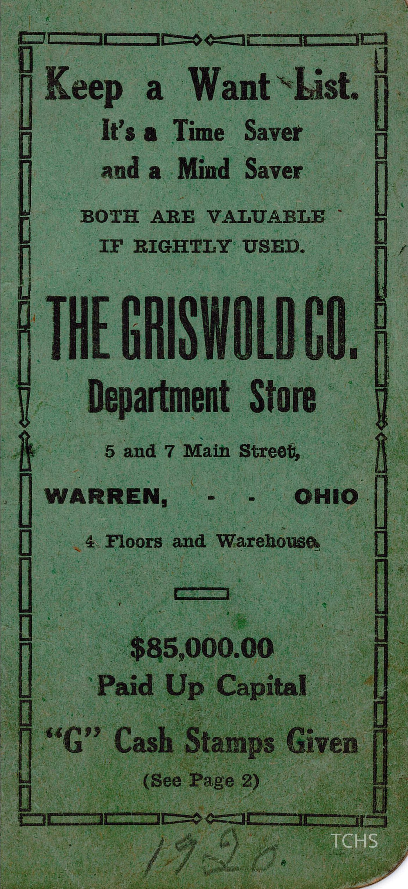 The Griswold Company Department Store advertisement notebook with scribbles in it.Location