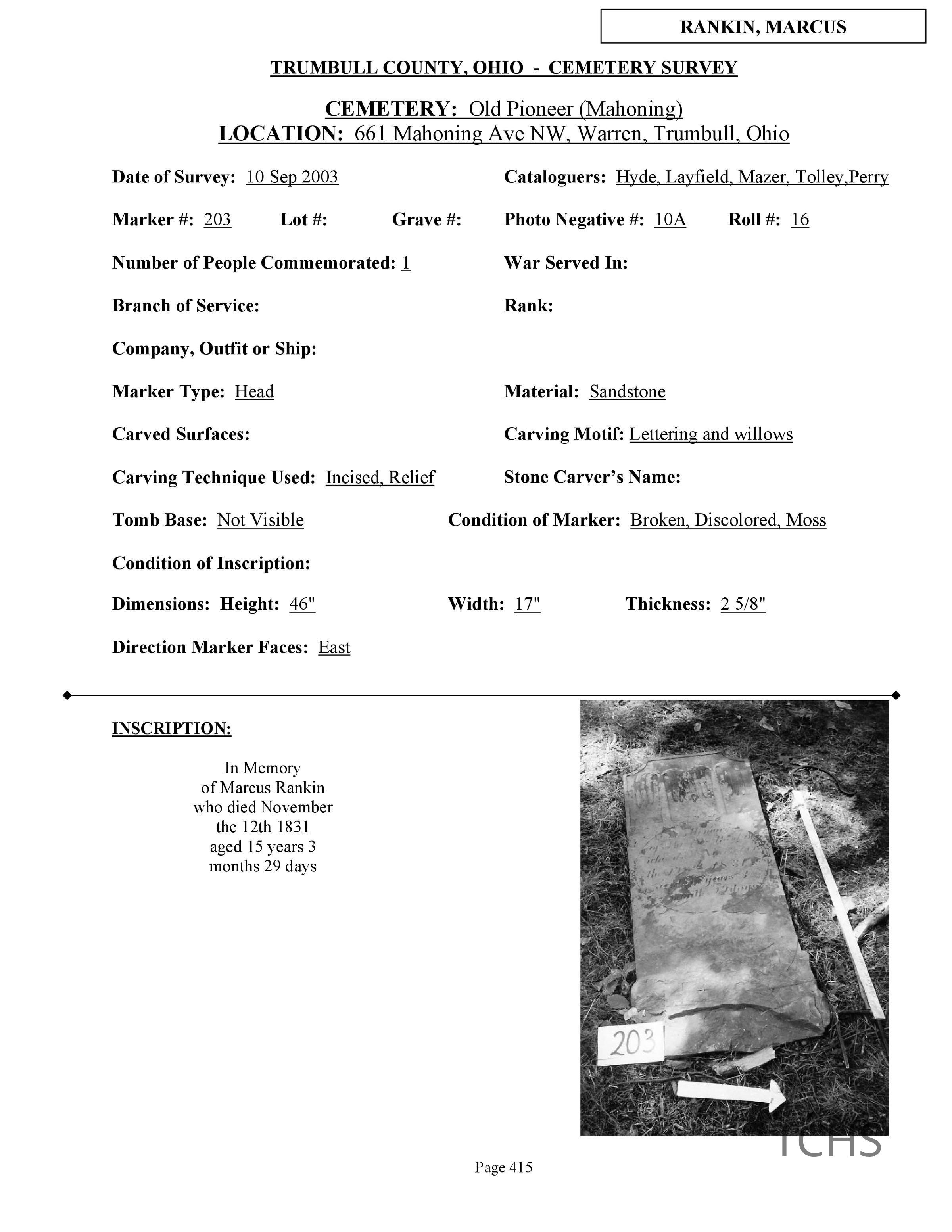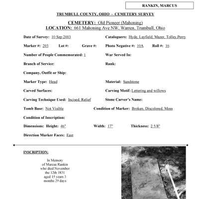 Marcus Rankin died November 12, 1831 at the age of 15 and is buried at the Old Mahoning (Pioneer) Cemetery.