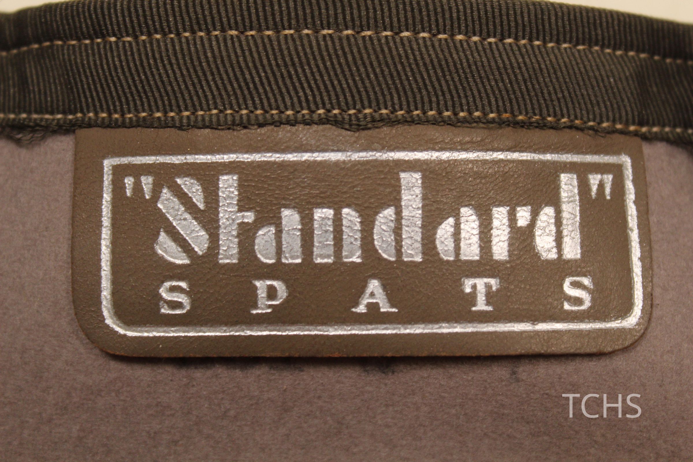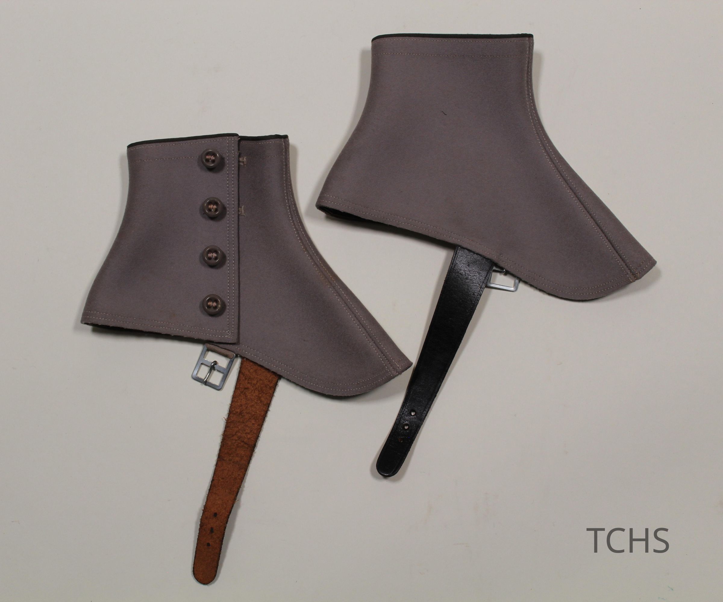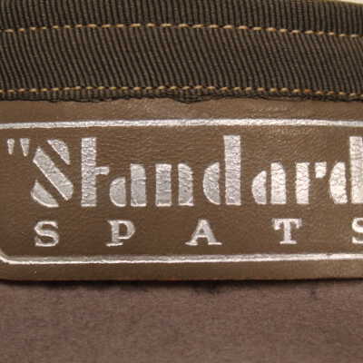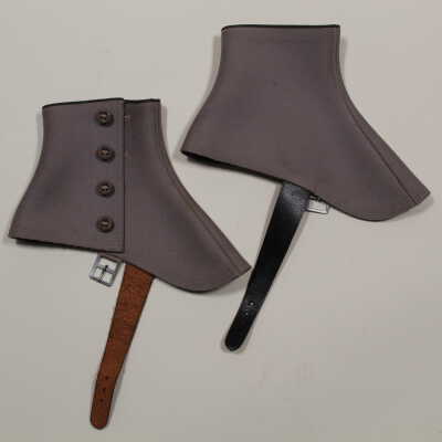 Gray spats with leather strap. "Standard" spats tag.