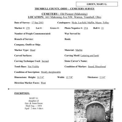 Mary G. Green died August 1854 at the age of 2 months and is buried at the Old Mahoning (Pioneer) Cemetery.