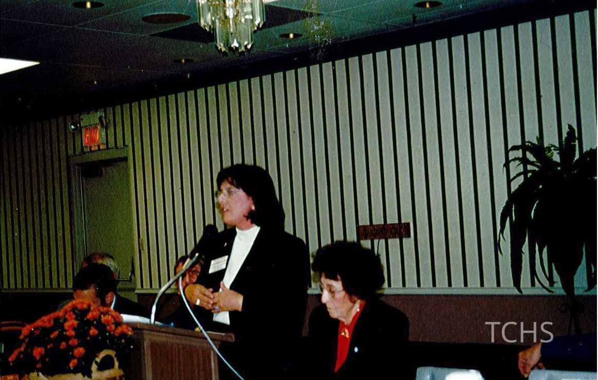 Trumbull Retired Teachers Association member Denise Bartholomew (red blouse) and an unidentified woman at the April 2003 meeting.Collection