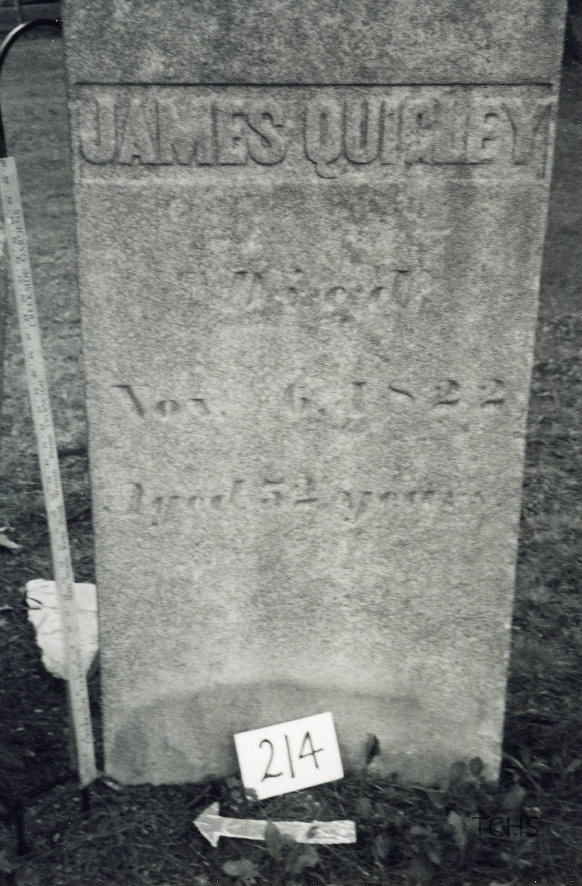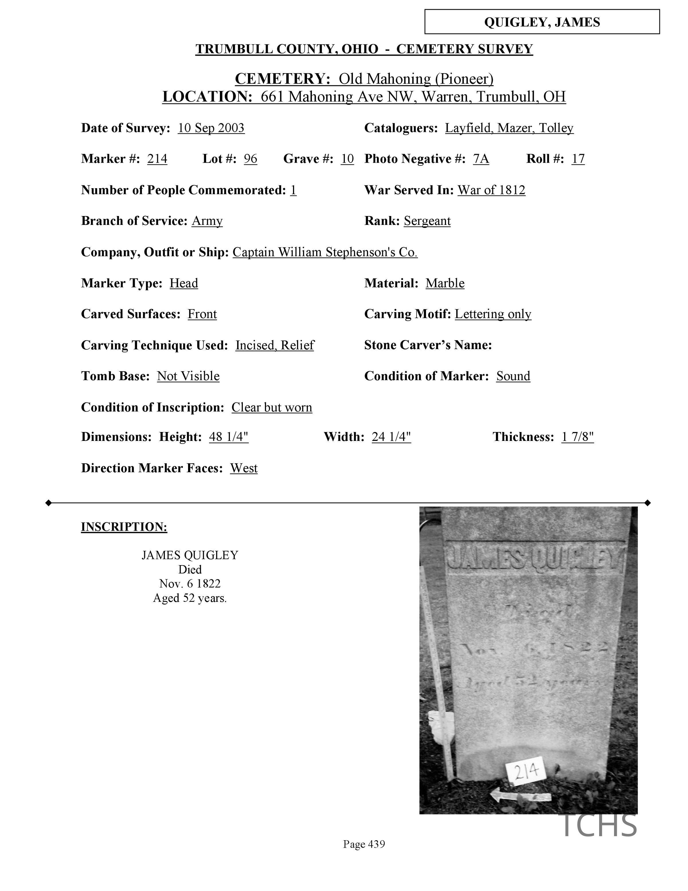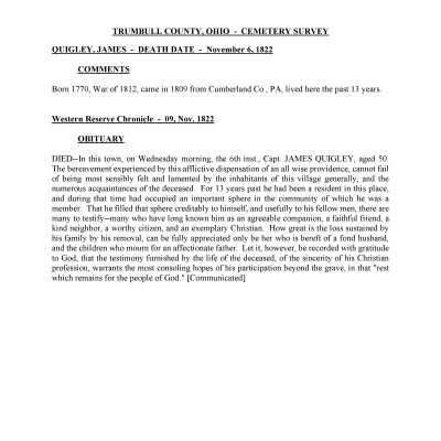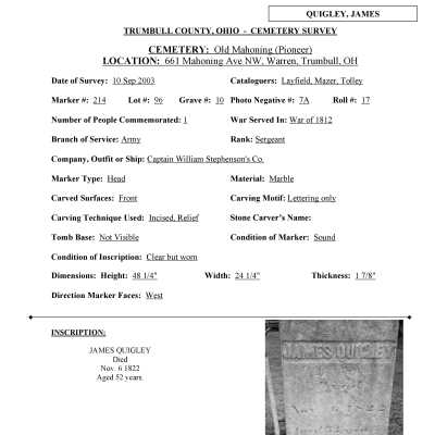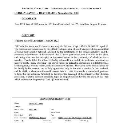 James Quigley died November 6, 1822 at the age of 52 and is buried at the Old Mahoning (Pioneer) Cemetery. *There is an additional page attached that was found in the Veterans Index*