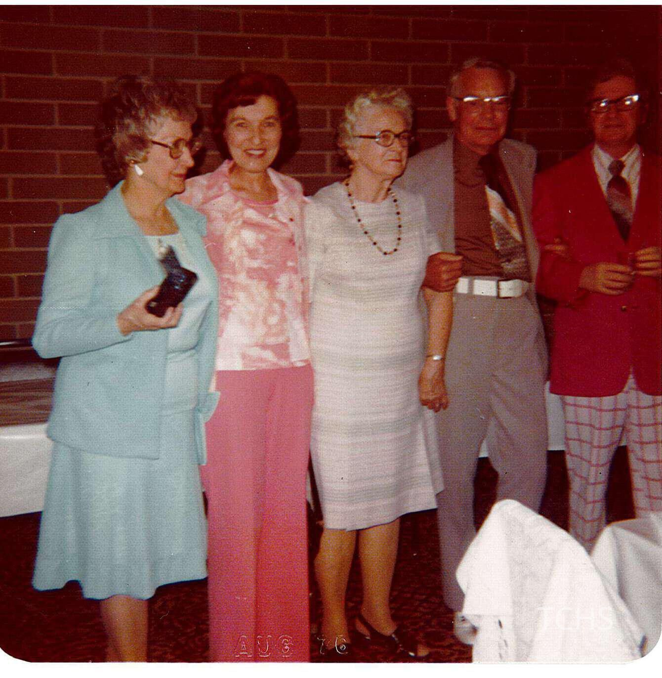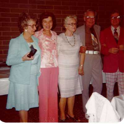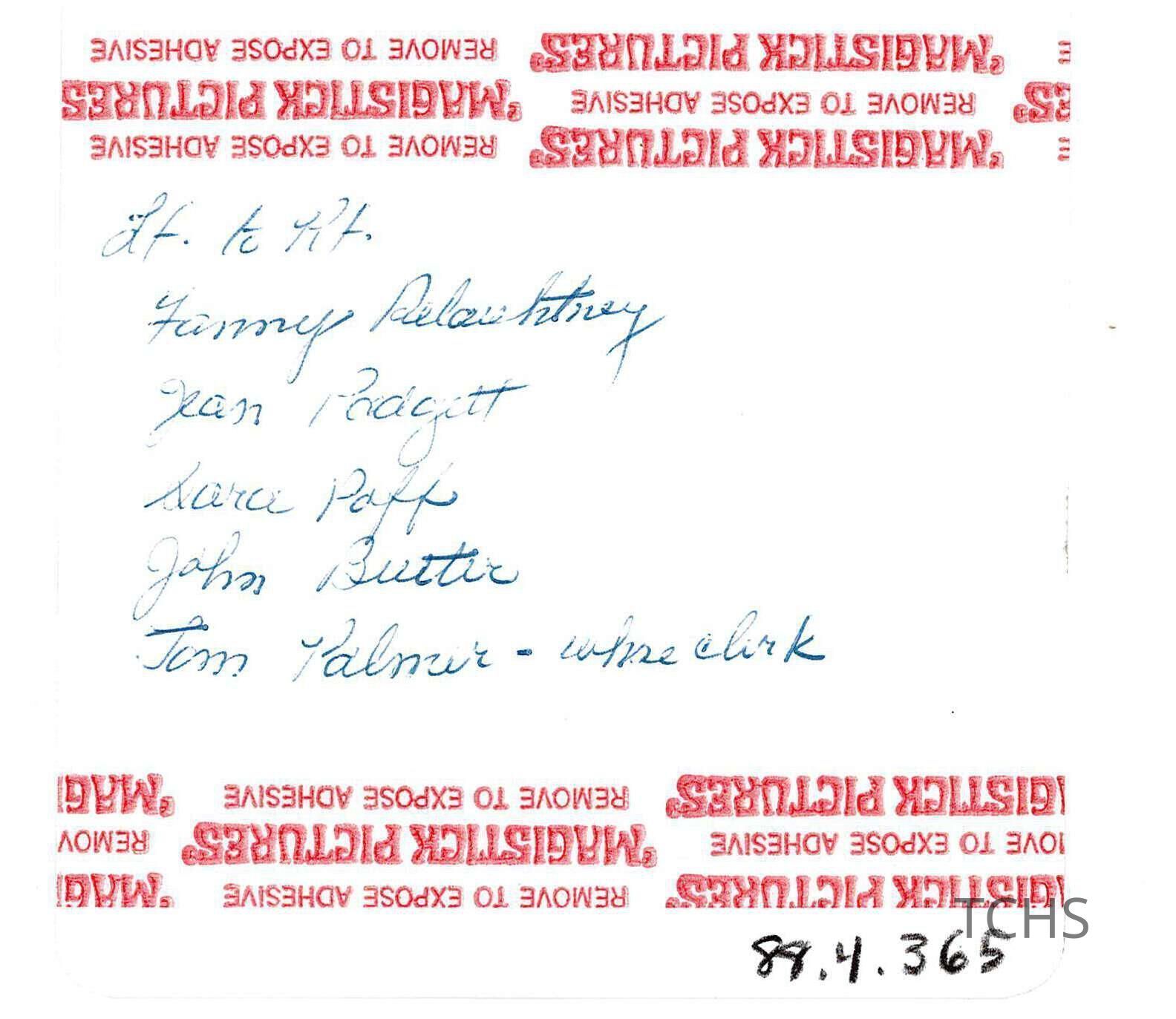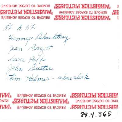 Grinnell event, undated. Written on the back: Left to right Fanny Delauhtney Jean Padgett Sara Paff John Butler Tom Palmer -- whse clerk