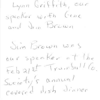 Lynn Griffith, our speaker with Gene and Jim Brown. Jim Brown was our speaker at the Feb 21st Trumbull Co. Society's annual covered dish dinner.Location