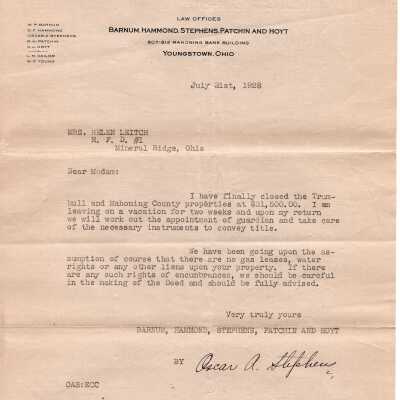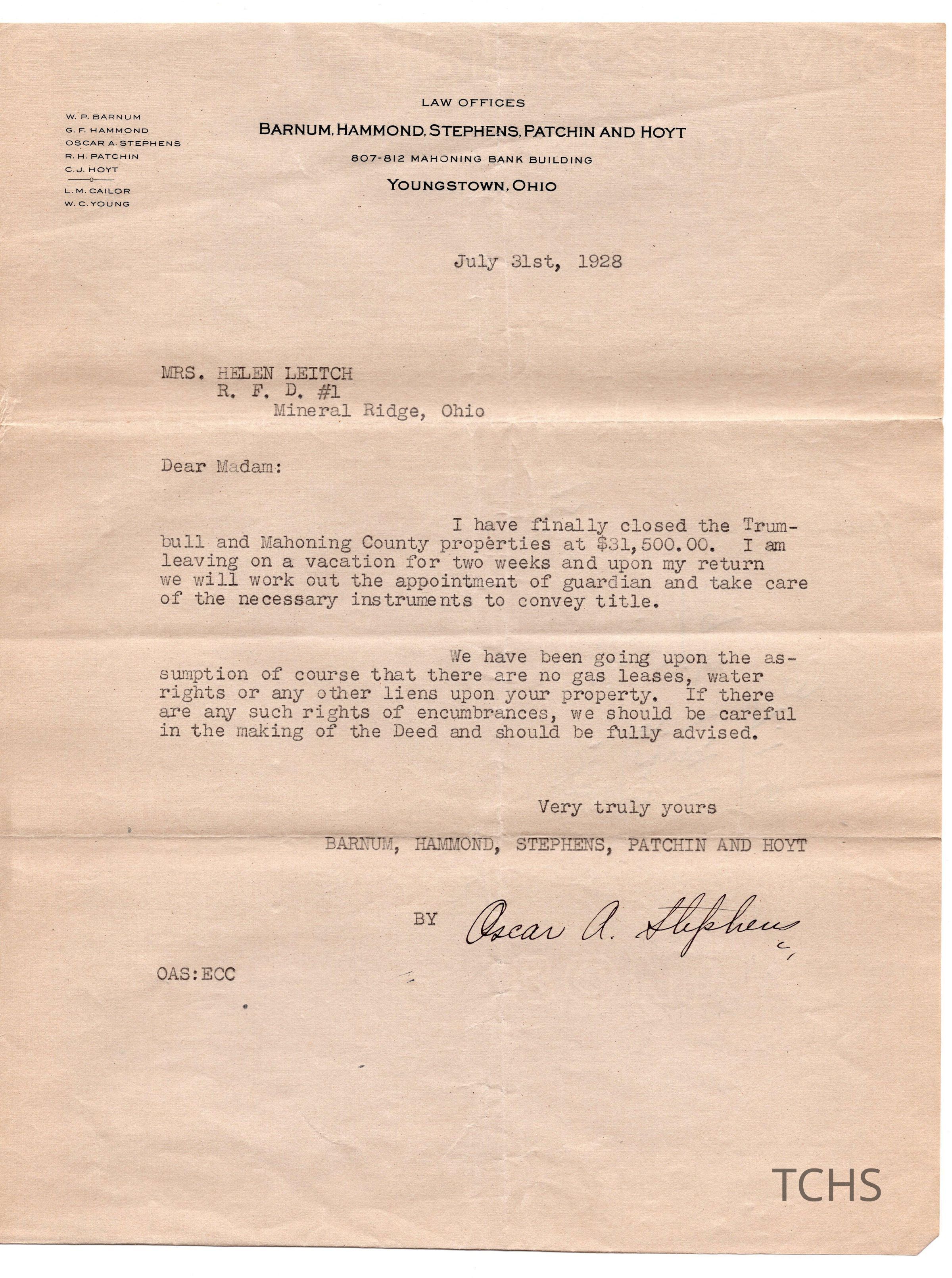 Letter to Helen Leitch from Oscar Stephens. Stephens closed two properties for a total of $31,500. Dated July 31st, 1928.