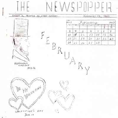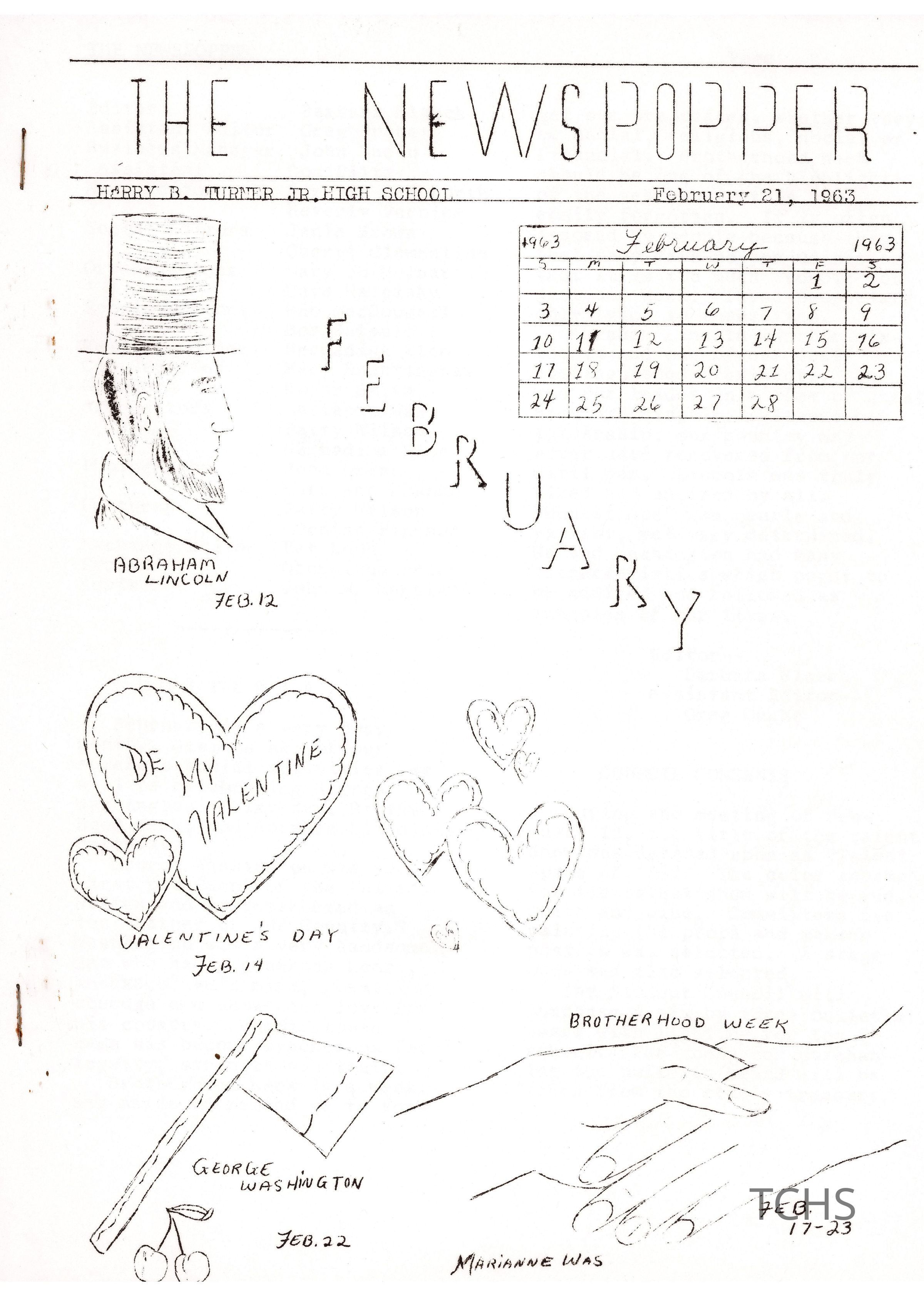 A hand-drawn, school newspaper page titled "The Newspopper" from Harry B. Turner Jr. High School, dated February 21, 1963. It features illustrations for February-themed events, including a profile of Abraham Lincoln with the date February 12 beneath it, a collection of hearts with the phrase "Be My Valentine" for Valentine’s Day on February 14, and an illustration of an axe with cherries for George Washington’s birthday on February 22.Acquisition