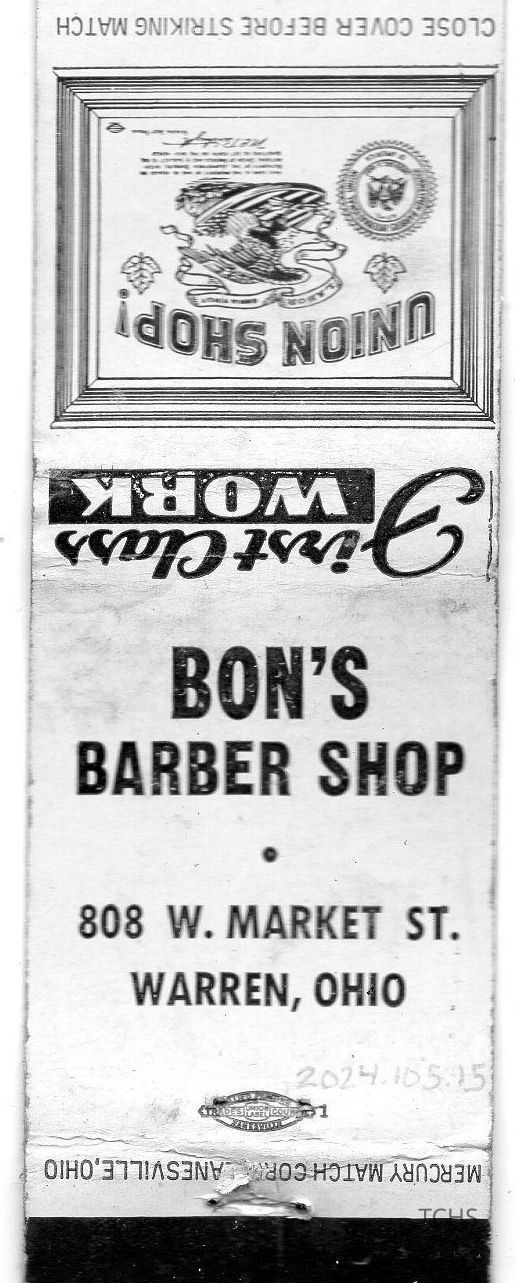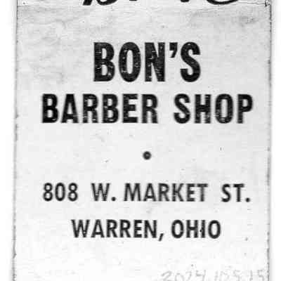 An undated matchbook of Bon's Barber Shop located at 808 W. Market St., Warren, OH.Acquisition