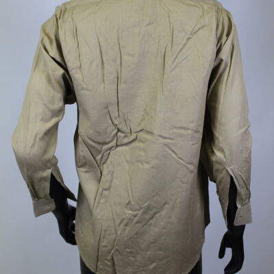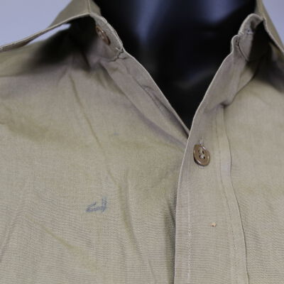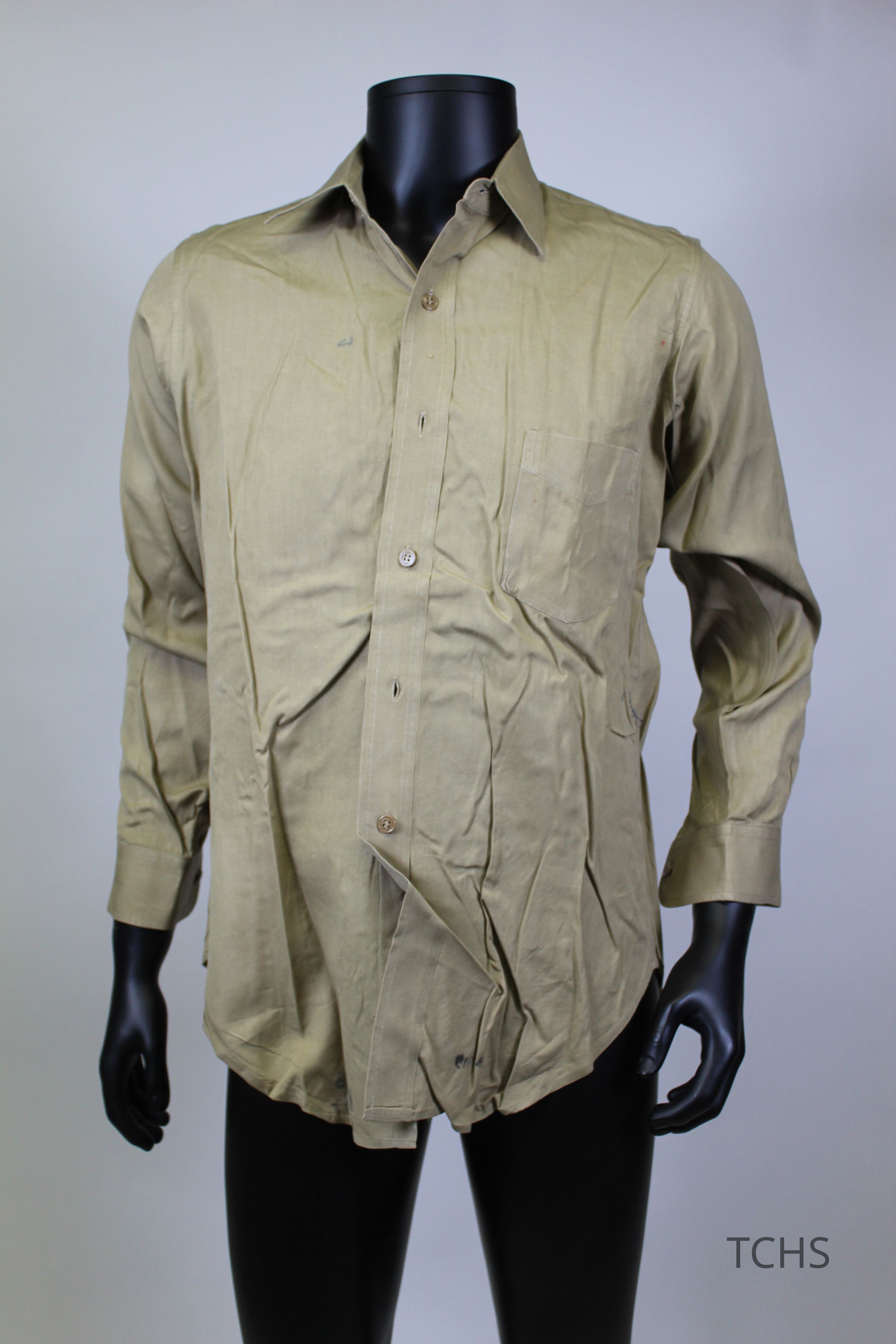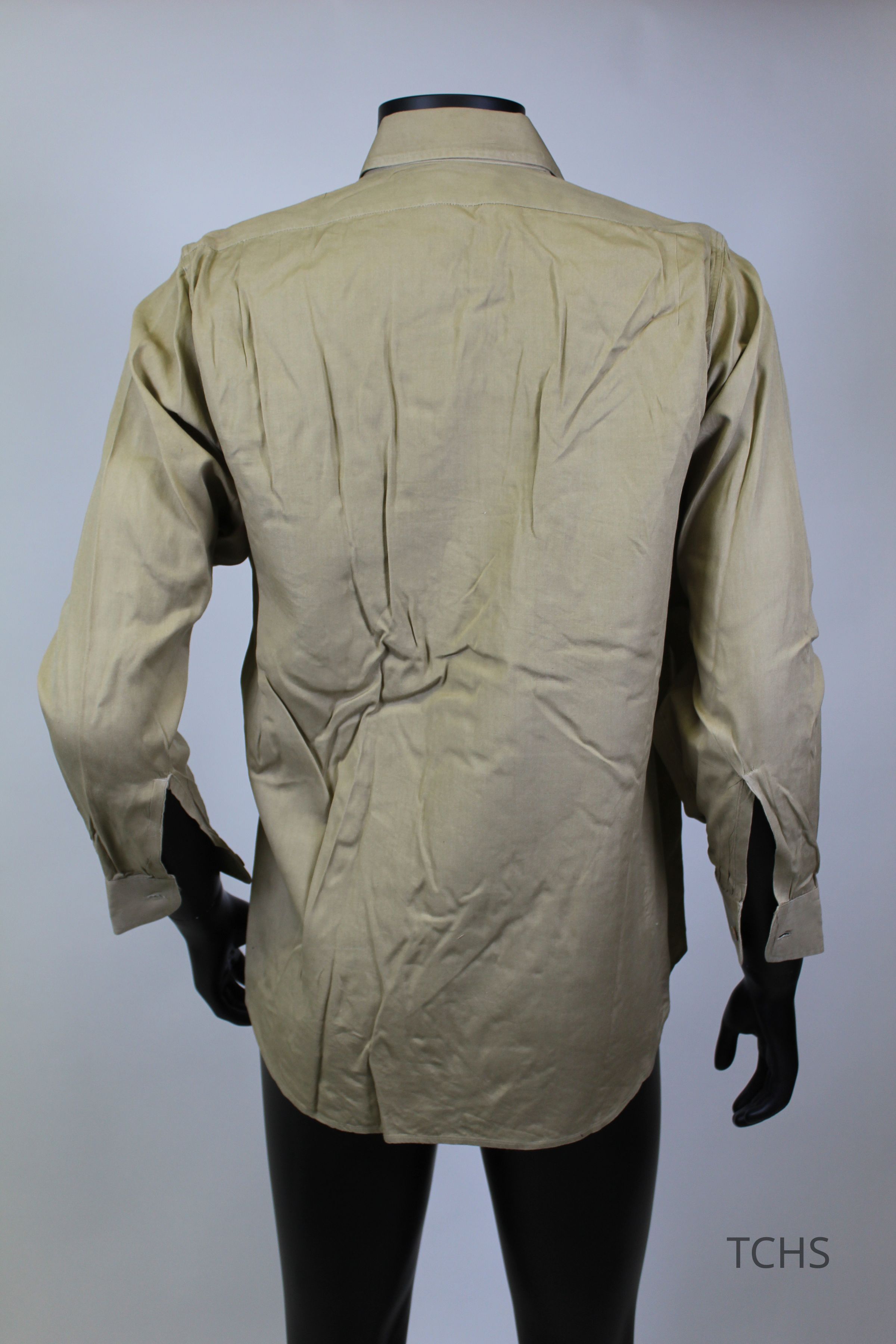 Korean War tan uniform shirt belonging to D. Boye. B-4913 is written on the inside.Acquisition