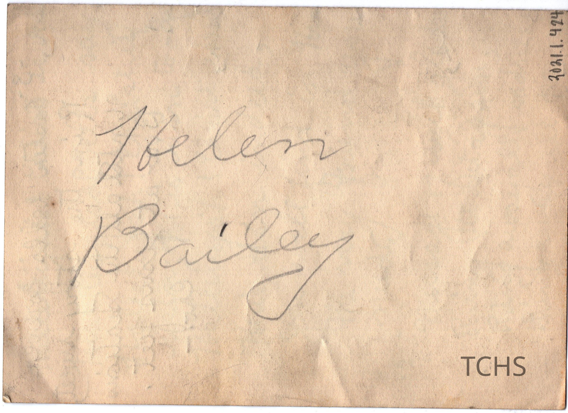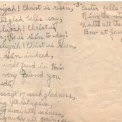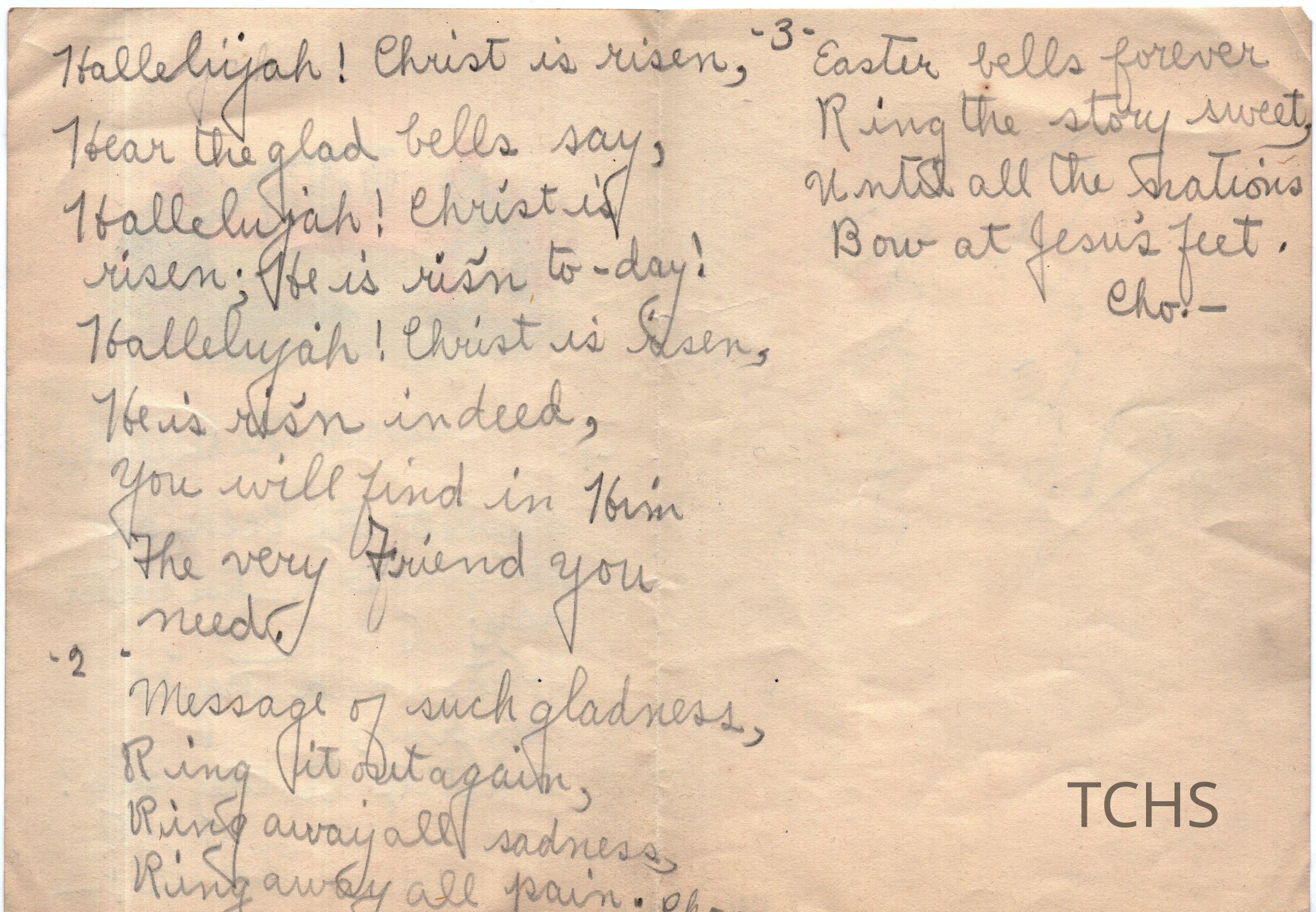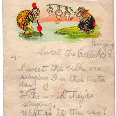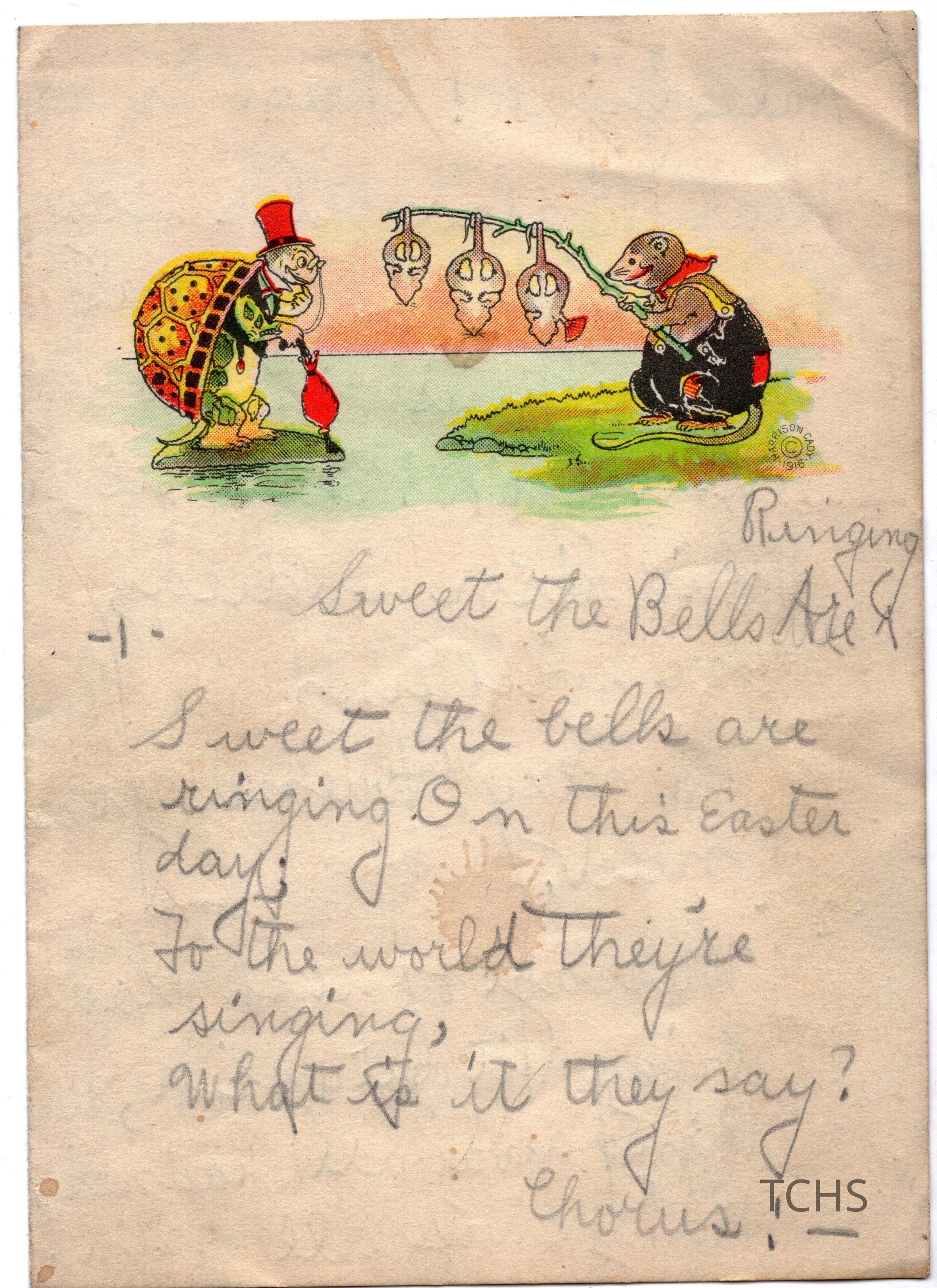 "Sweet the Bells are Ringing" poem/song lyrics written on a card with a cartoon of a turtle and mole. Helen Bailey written on back.Location
