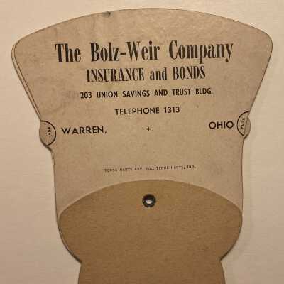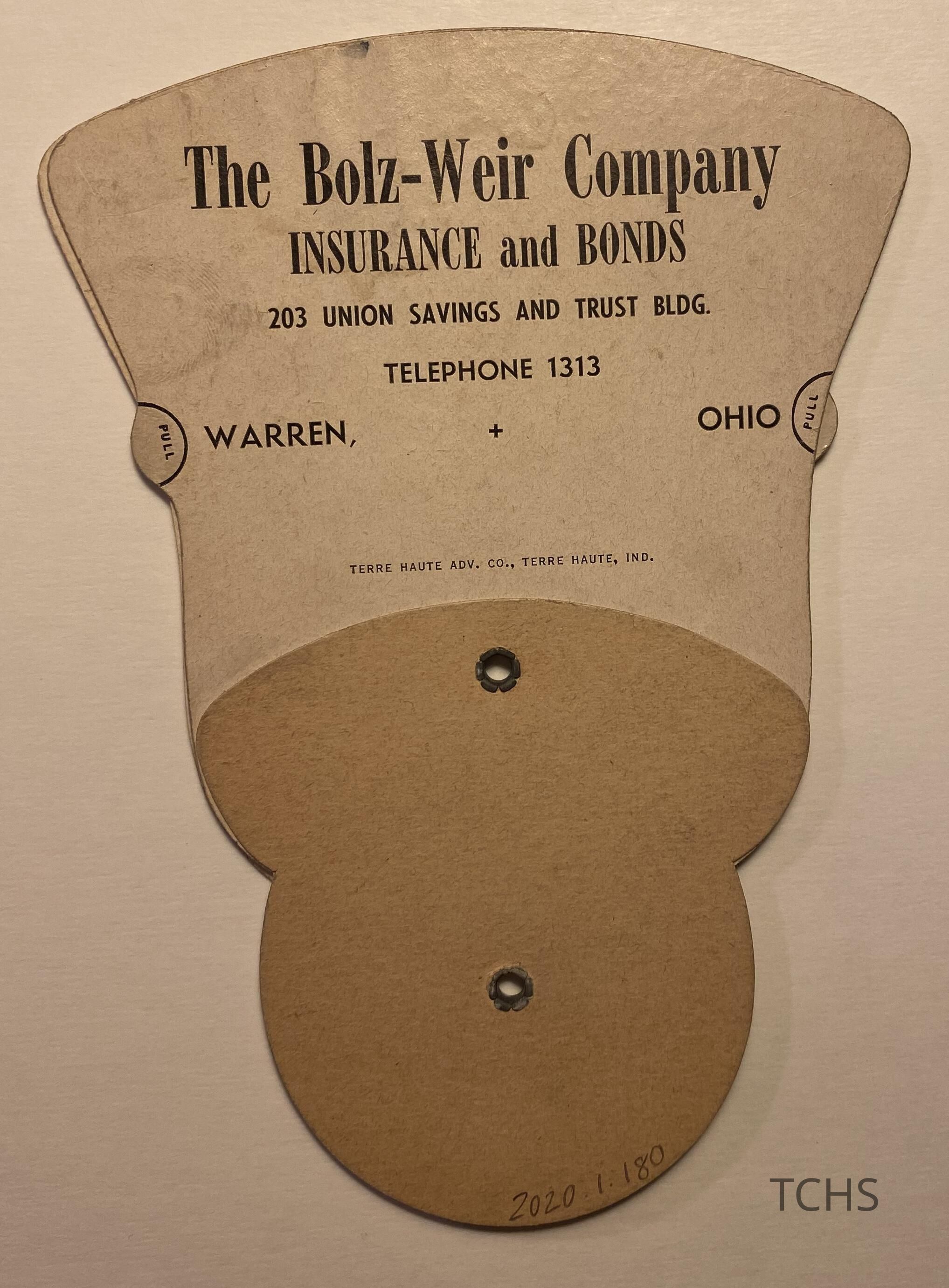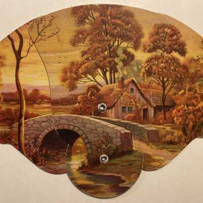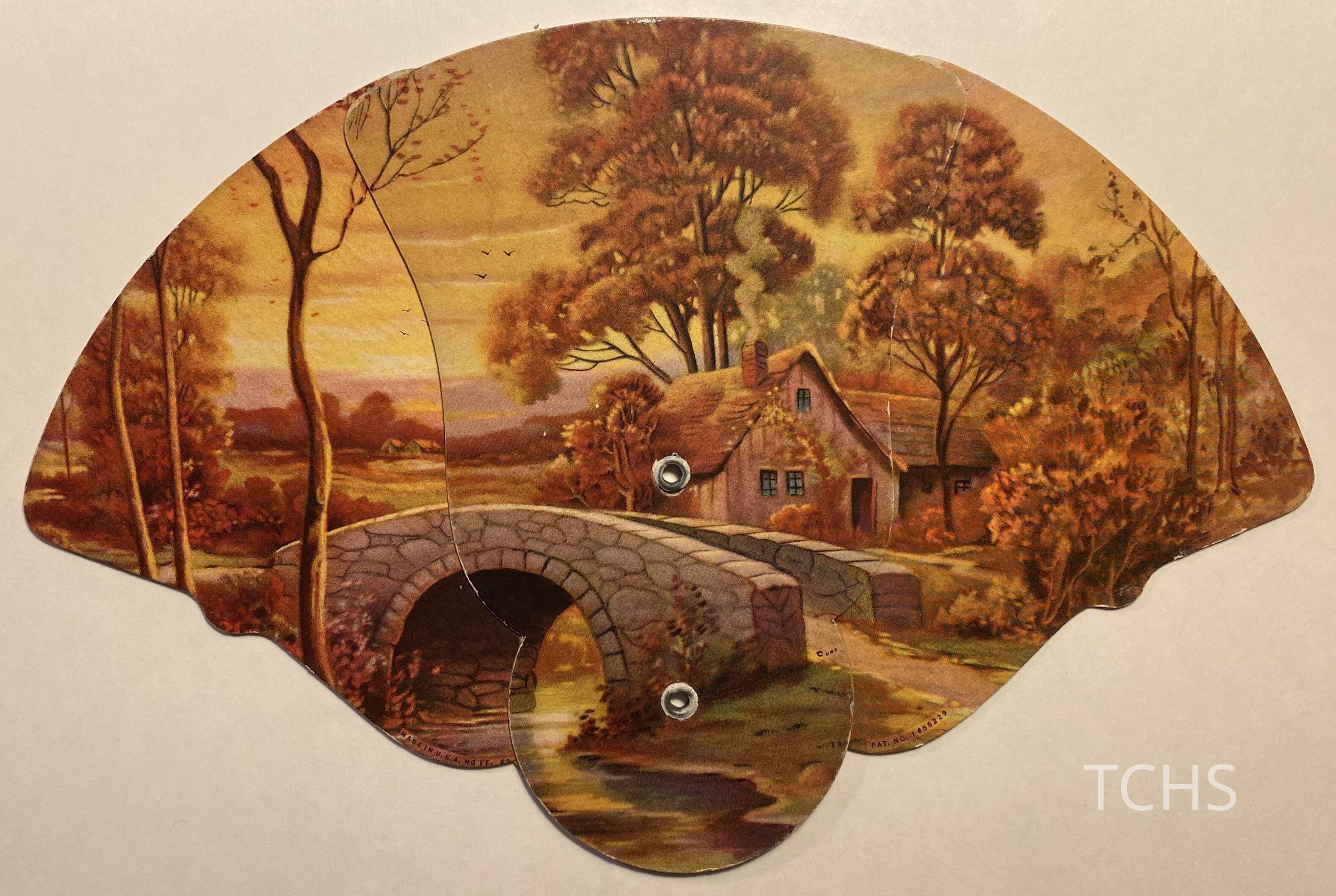 The Bolz-Weir Insurance Company cardstock folding fan. Fan features image of a cottage behind a stone arched bridge in the fall.Relationships