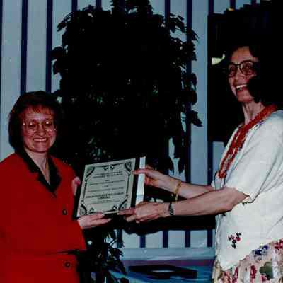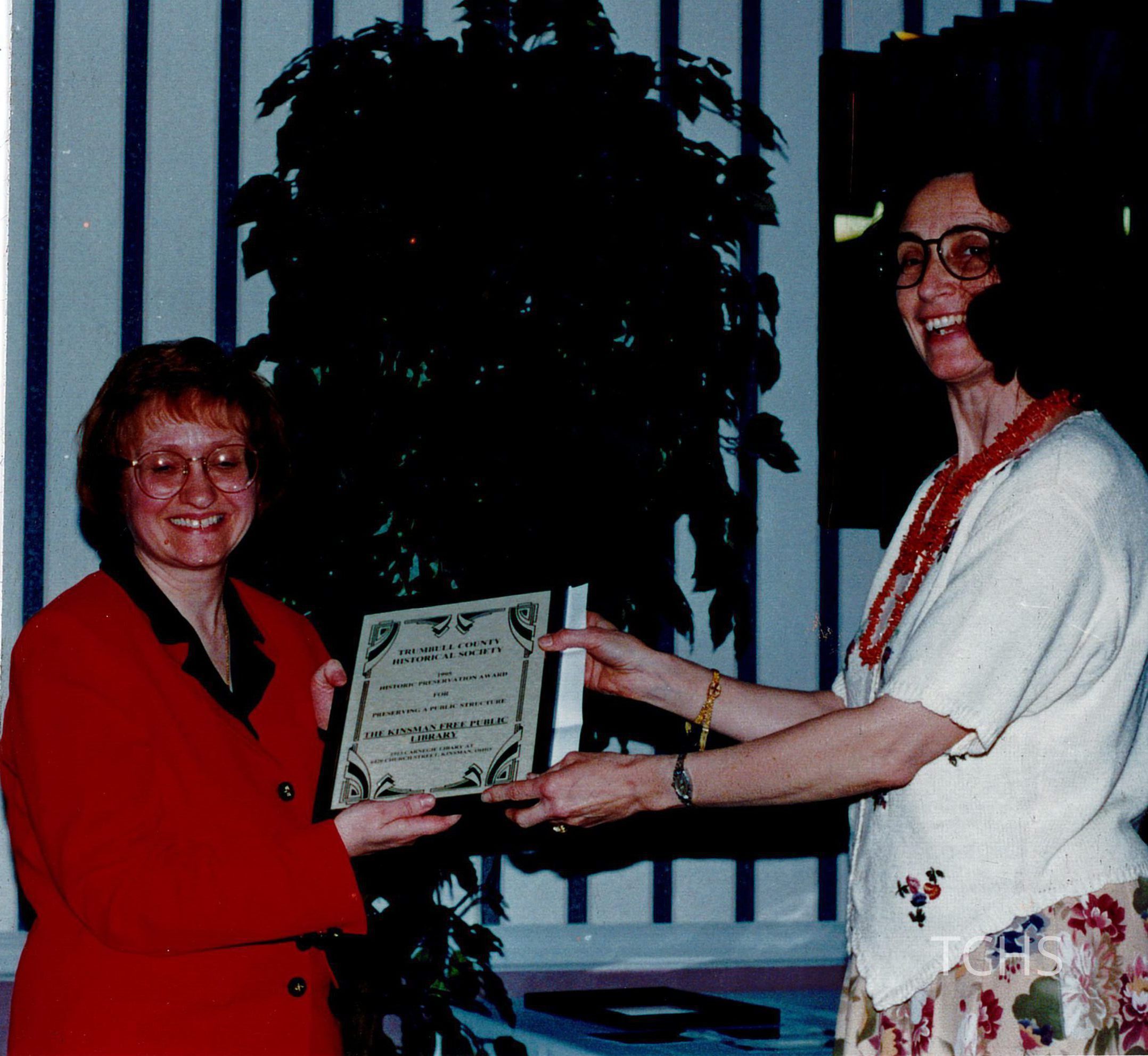 Unidentified woman hands the award to a representative from Kinsman Library at the Trumbull County Historical Society's 57th annual meeting dated for April 20, 1995 at 6:30pm.Location