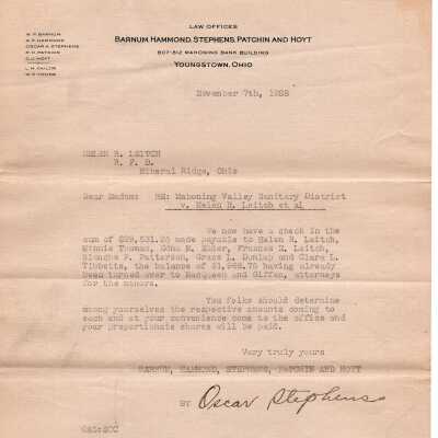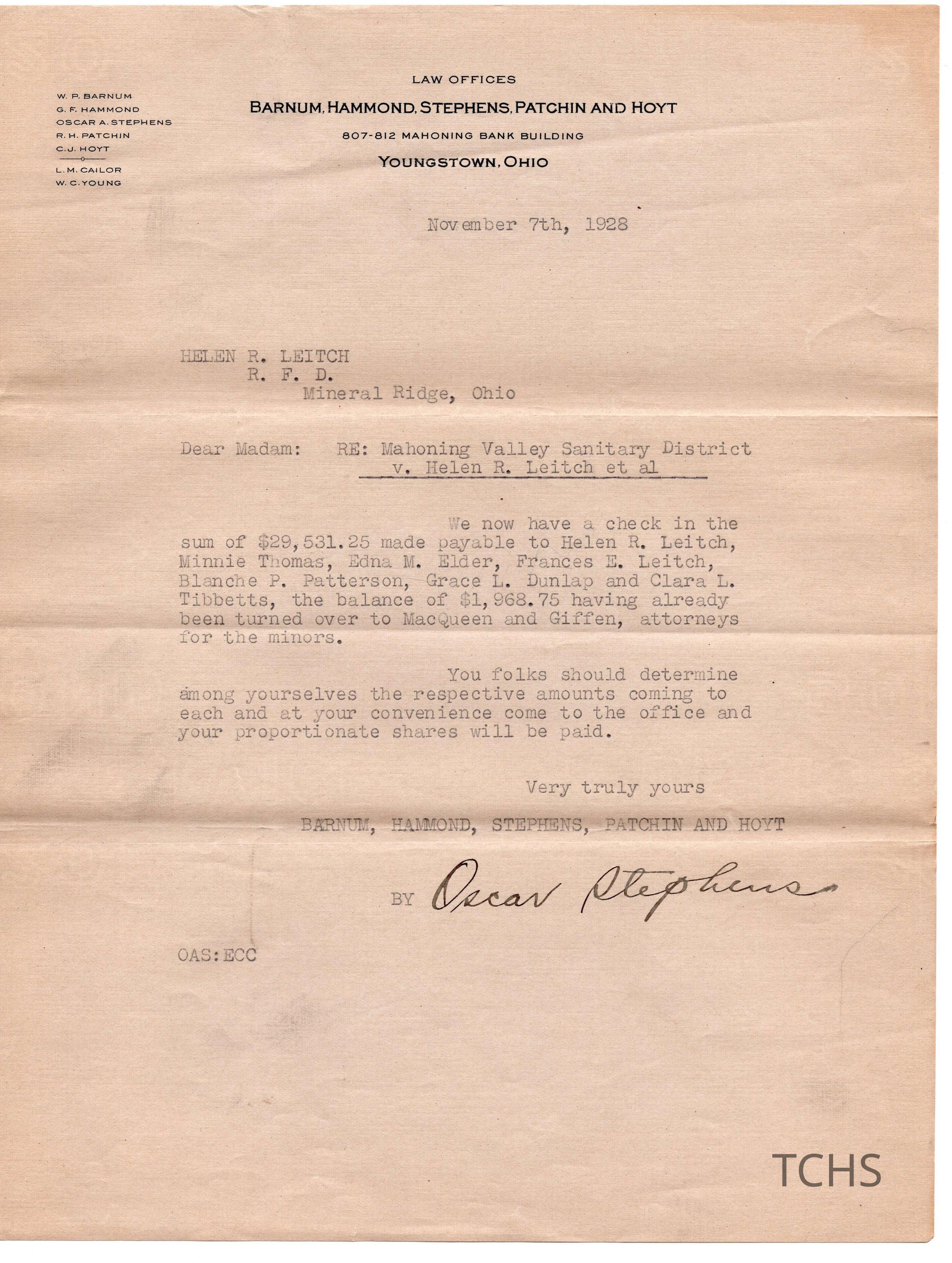 Letter to Helen Leitch from Oscar Stephens about a check for the sum of $29,531 and the need to distribute the sum amongst the heirs. Dated November 7, 1928