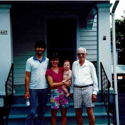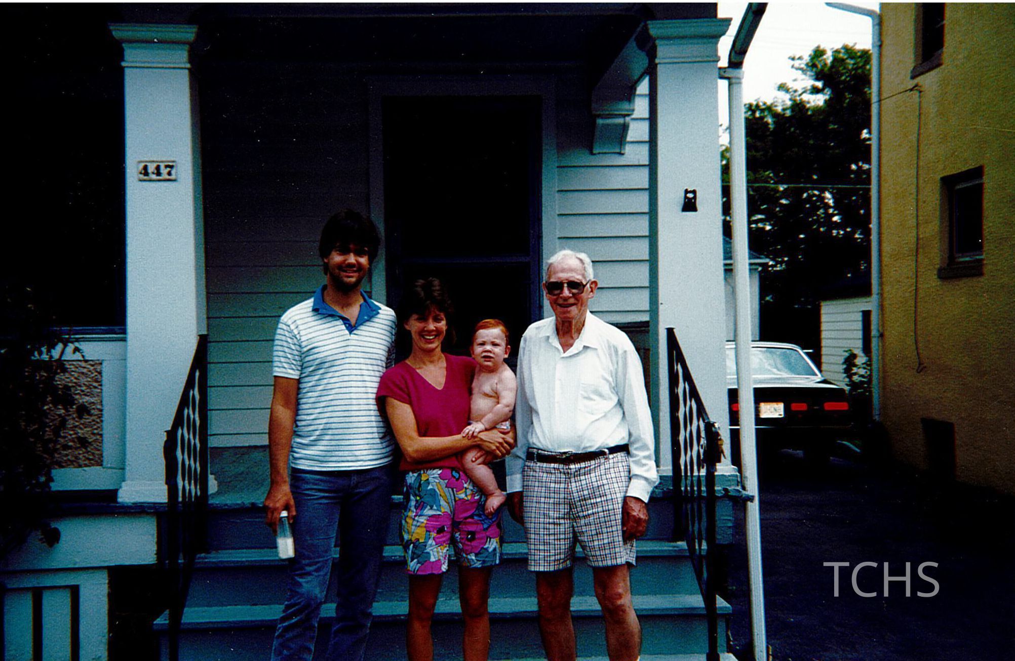 A photograph of Tim, Robin, Kyle Garrett, and grandpa in 1986 standing on the porch of 447.Collection