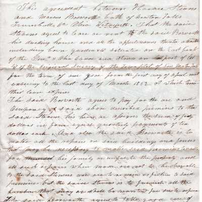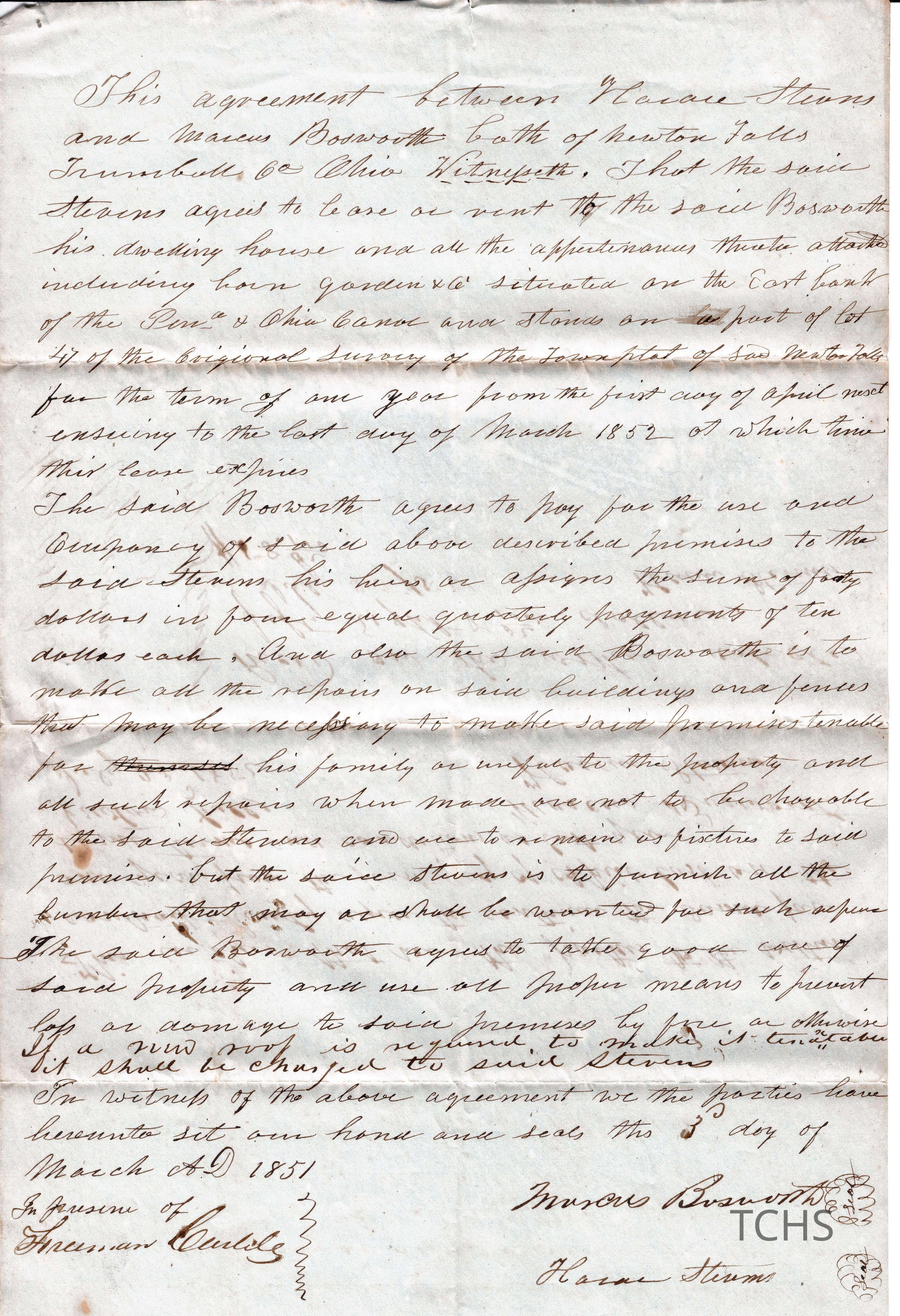 Agreement between Horace Stevens and Marcus Bosworth renting Bosworth space in Steven's dwelling house in Newton Falls. Agreement is dated 1851.Location