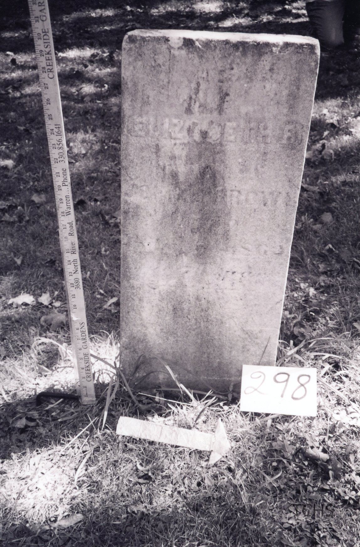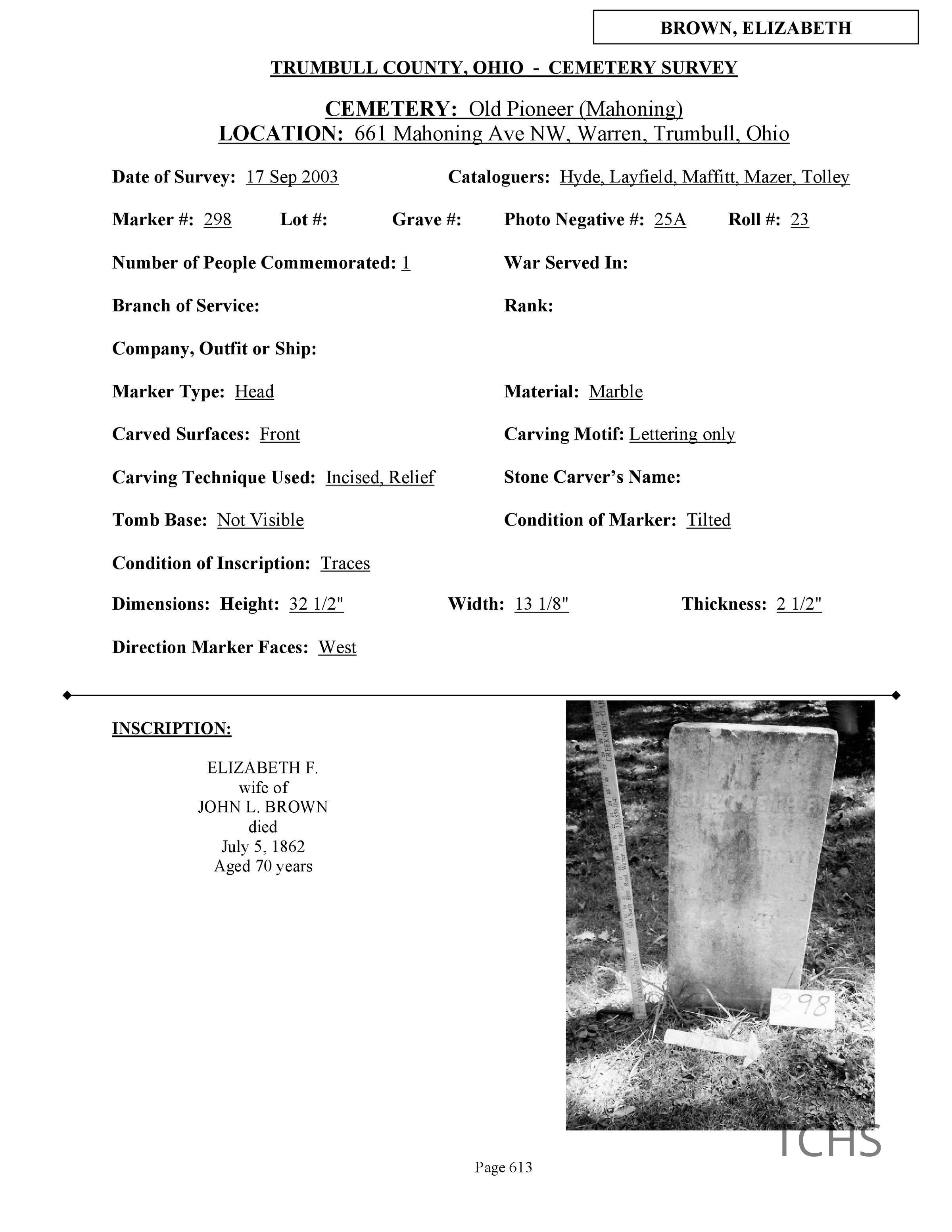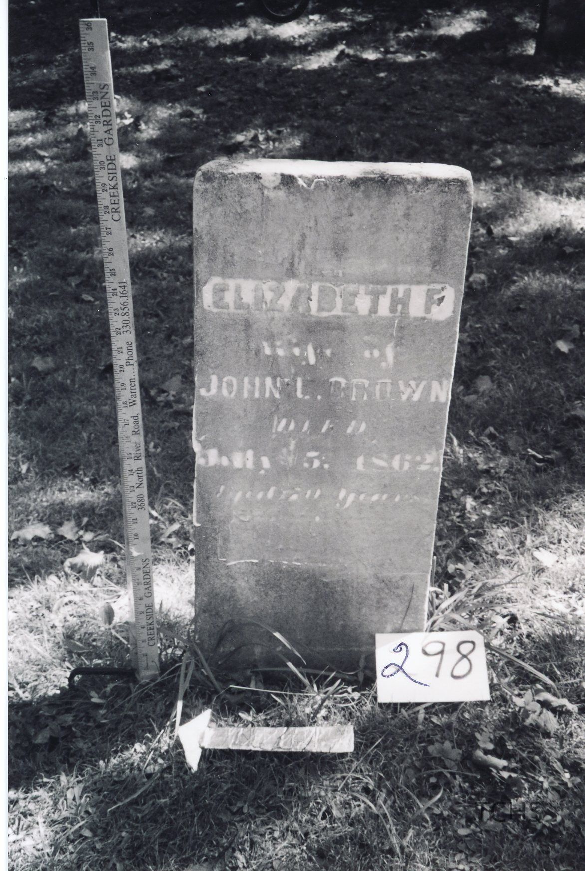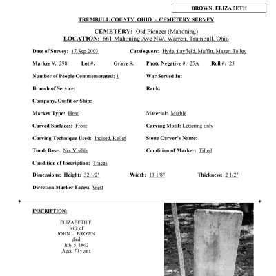 Elizabeth Brown died July 5, 1862 at the age of 70 and is buried at the Old Mahoning (Pioneer) Cemetery.