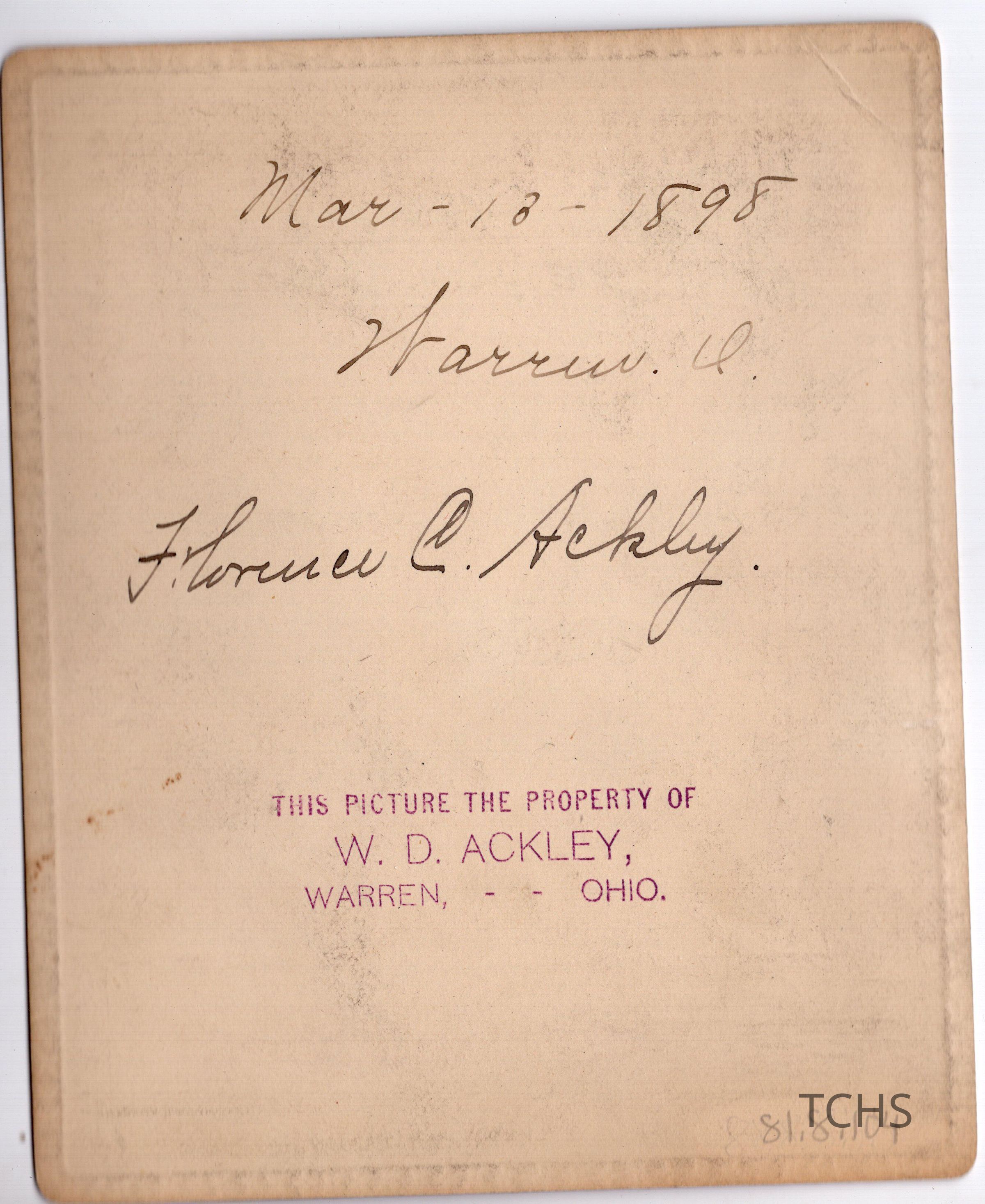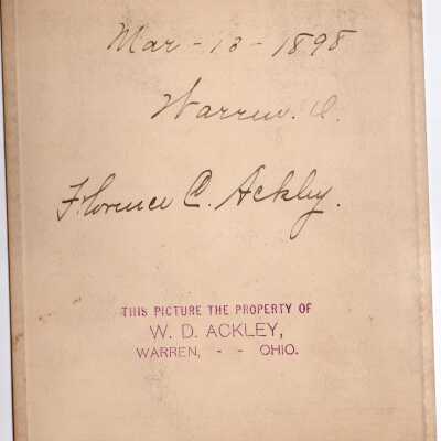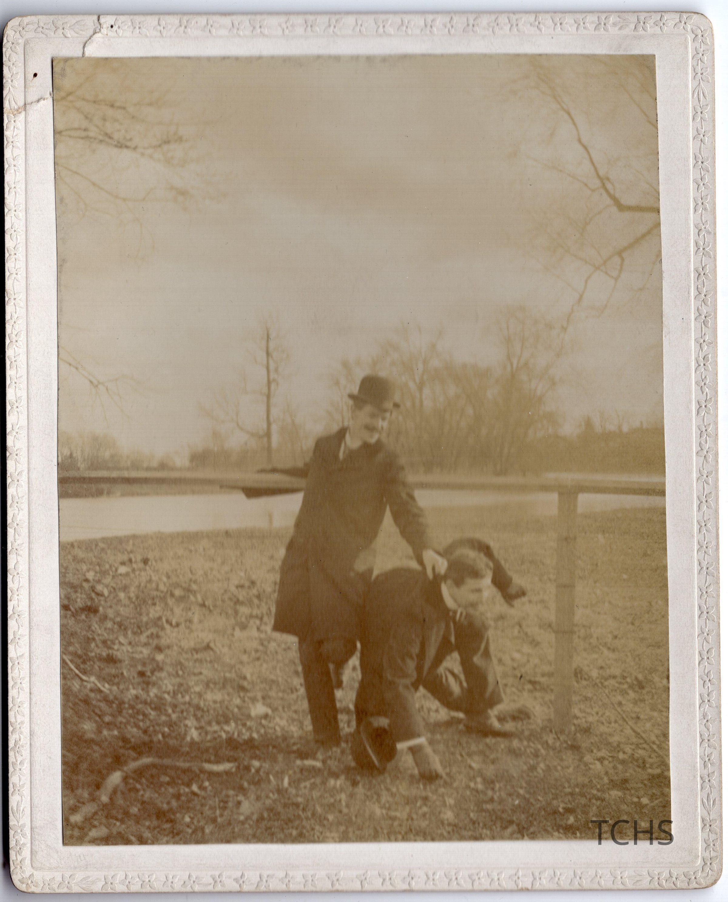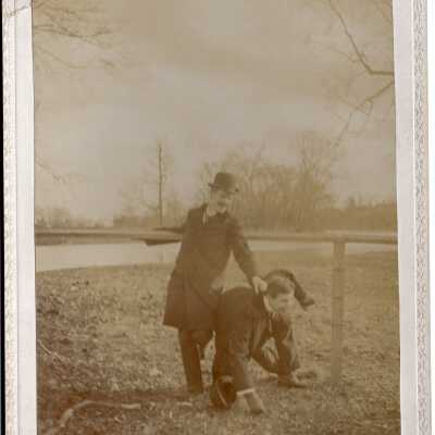 Image of 2 men climbing around a fence. Stamped “Property of W.D. Ackley Warren Ohio”. Handwritten "Florence Ackley Warren Ohio Mar-13-1898”Acquisition