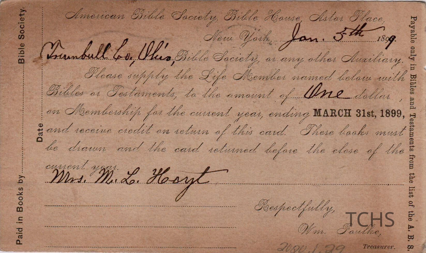 Membership card for F. H. Jameson from the Trumbull County Bible Society