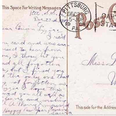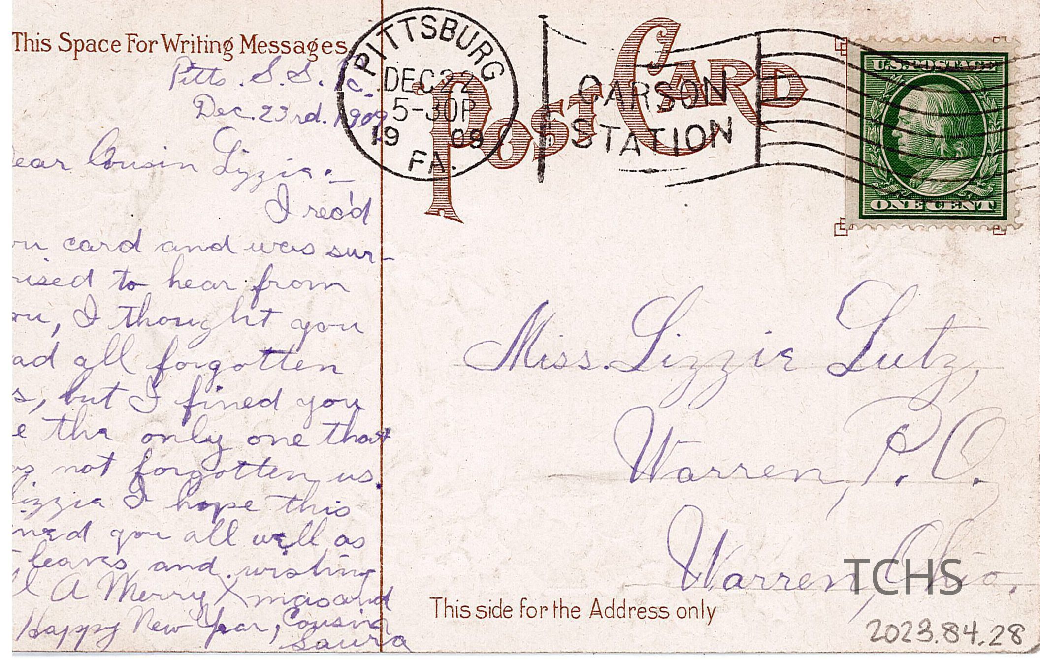 A Christmas postcard to Elizabeth "Lizzie" Lutz from cousin Laura sent on December 22nd, 1909.Acquisition
