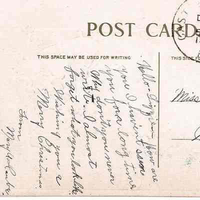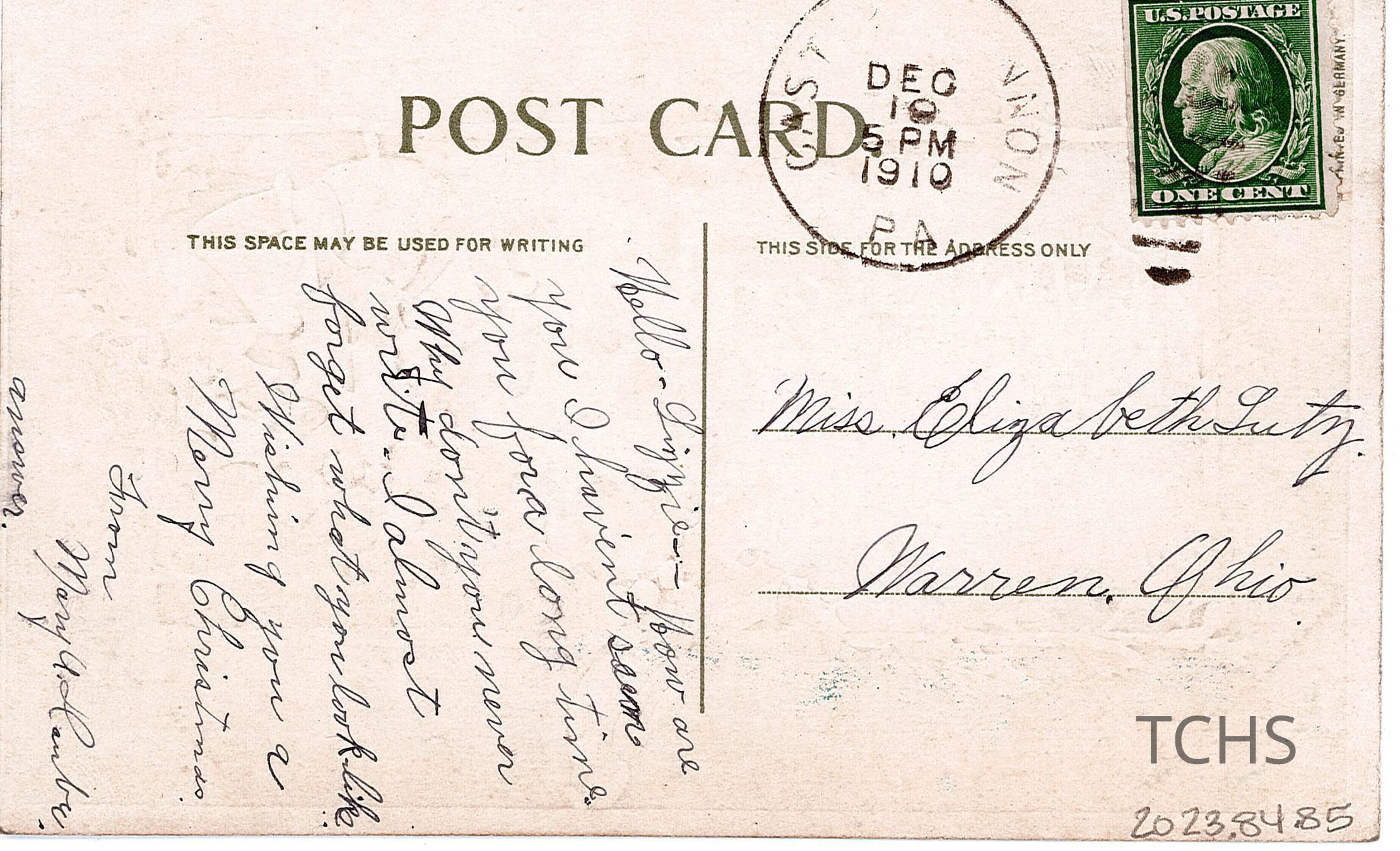 A postcard to Elizabeth “Lizzie” Lutz sent from her friend Mary, sent December 19th, 1910.Acquisition