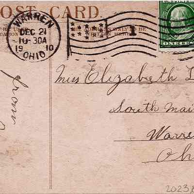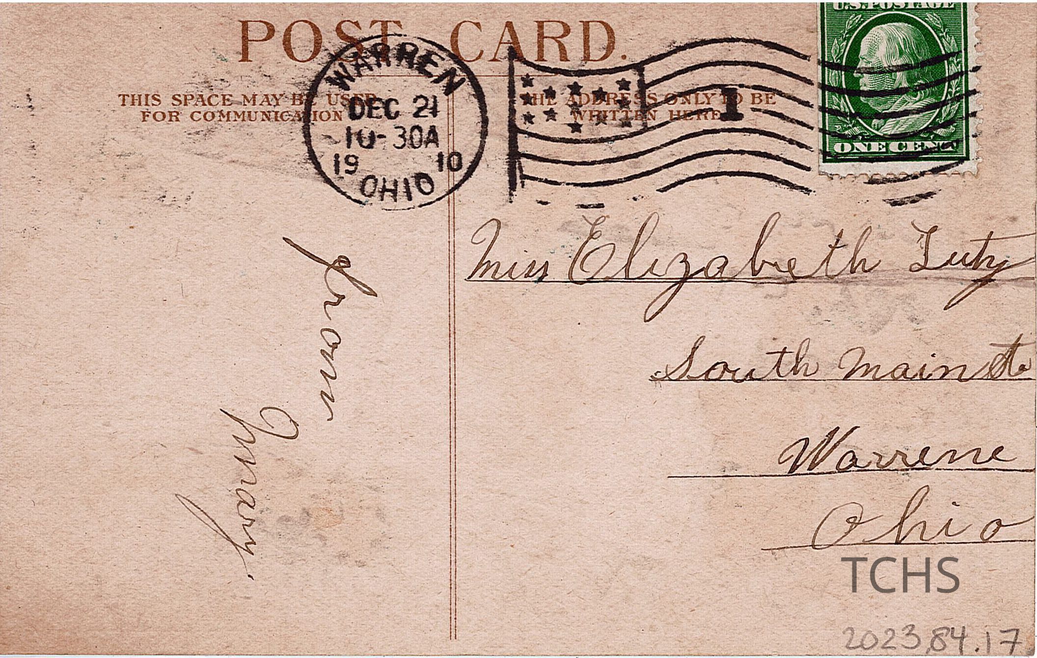 A Christmas postcard to Elizabeth "Lizzie" Lutz from Mary sent on December 21st, 1910.Acquisition