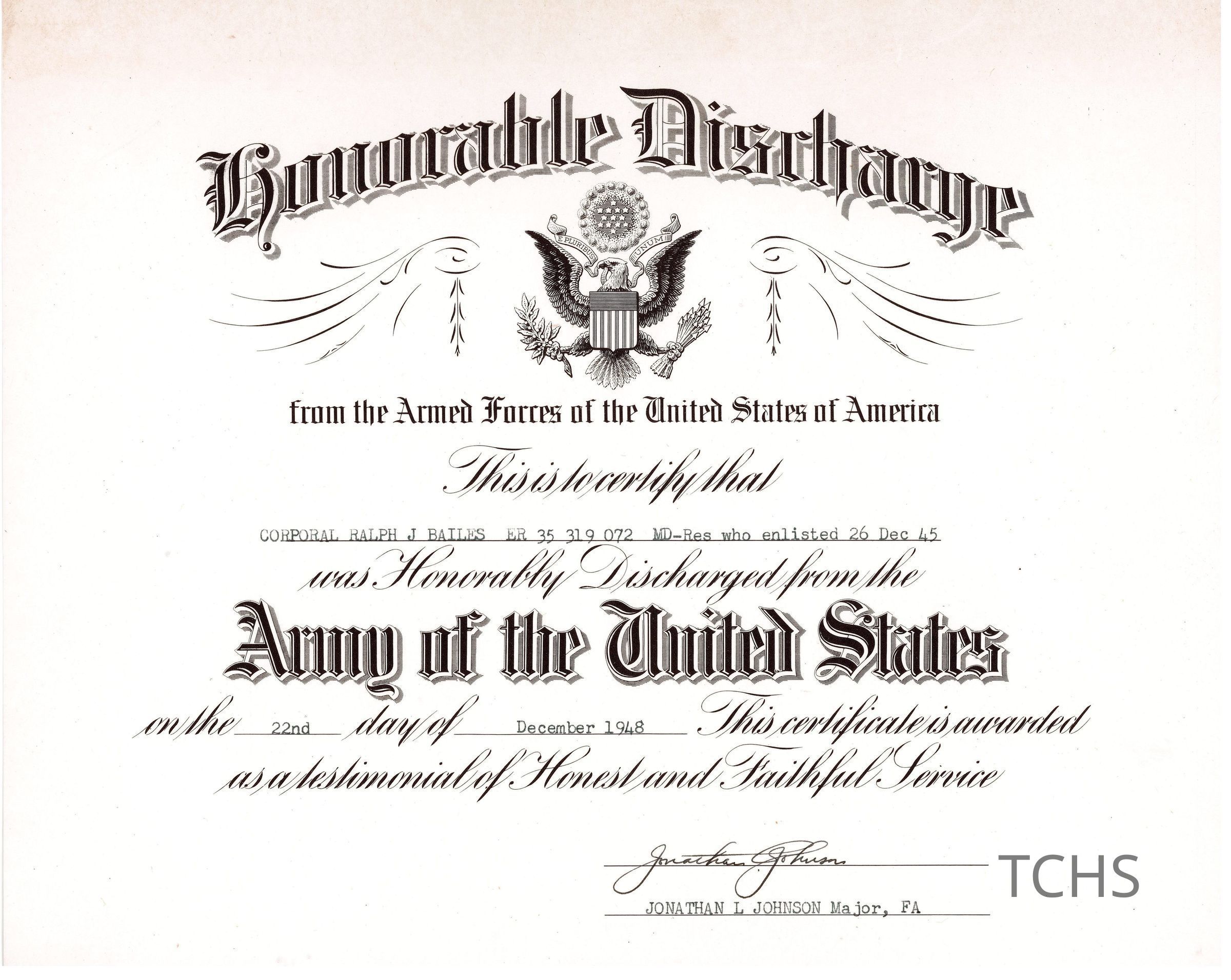 Certificate of honorable discharge for Ralph Bailes from the United States ArmyDate(s) of Creation