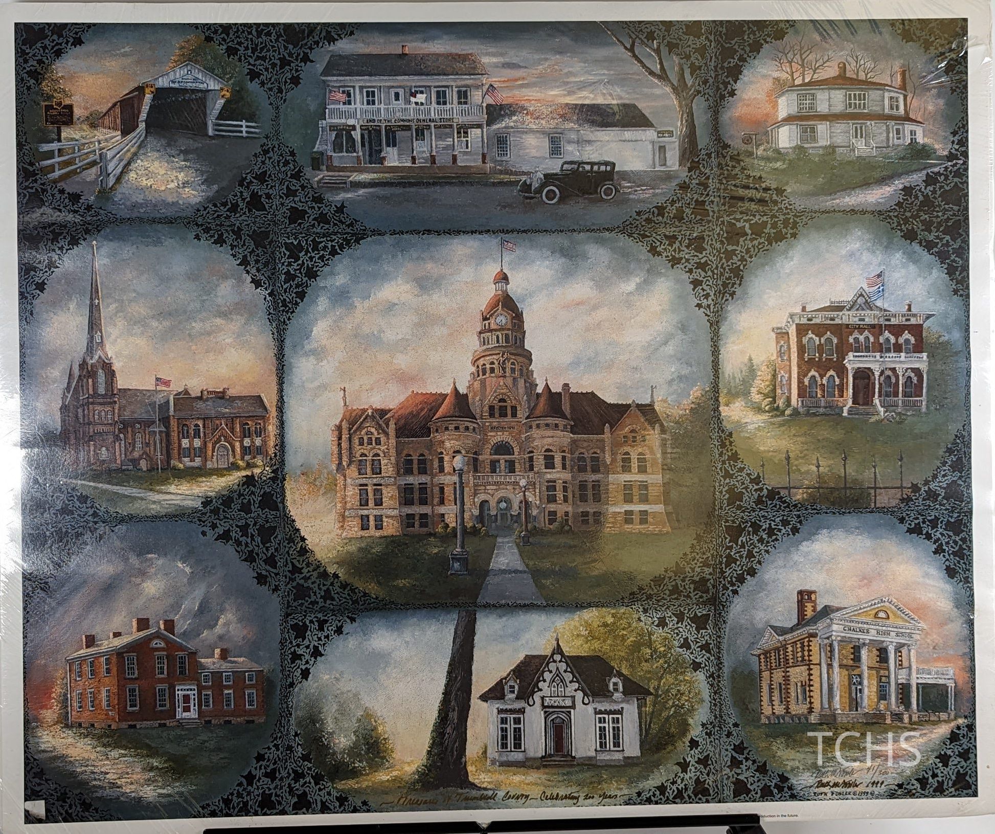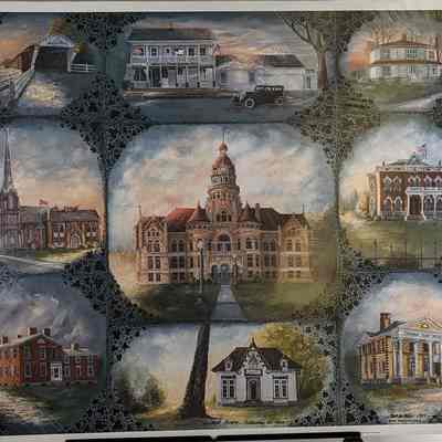 A poster of nine historic buildings around Trumbull County, created by local artist Ruth M. Fowler