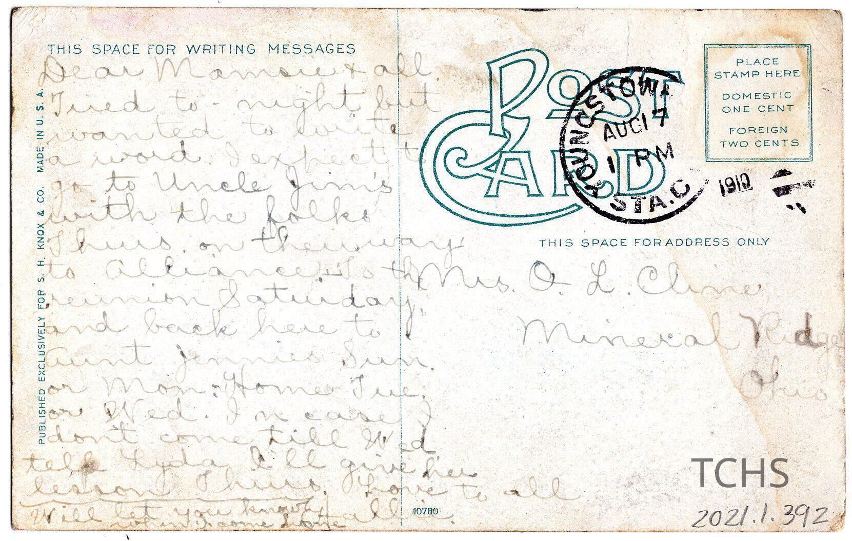 Youngstown postcard addressed to Charlotte Cline of Mineral Ridge, Ohio.