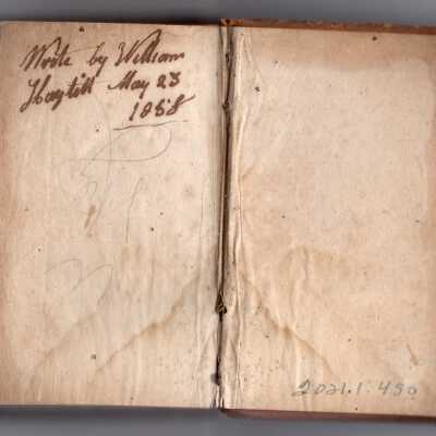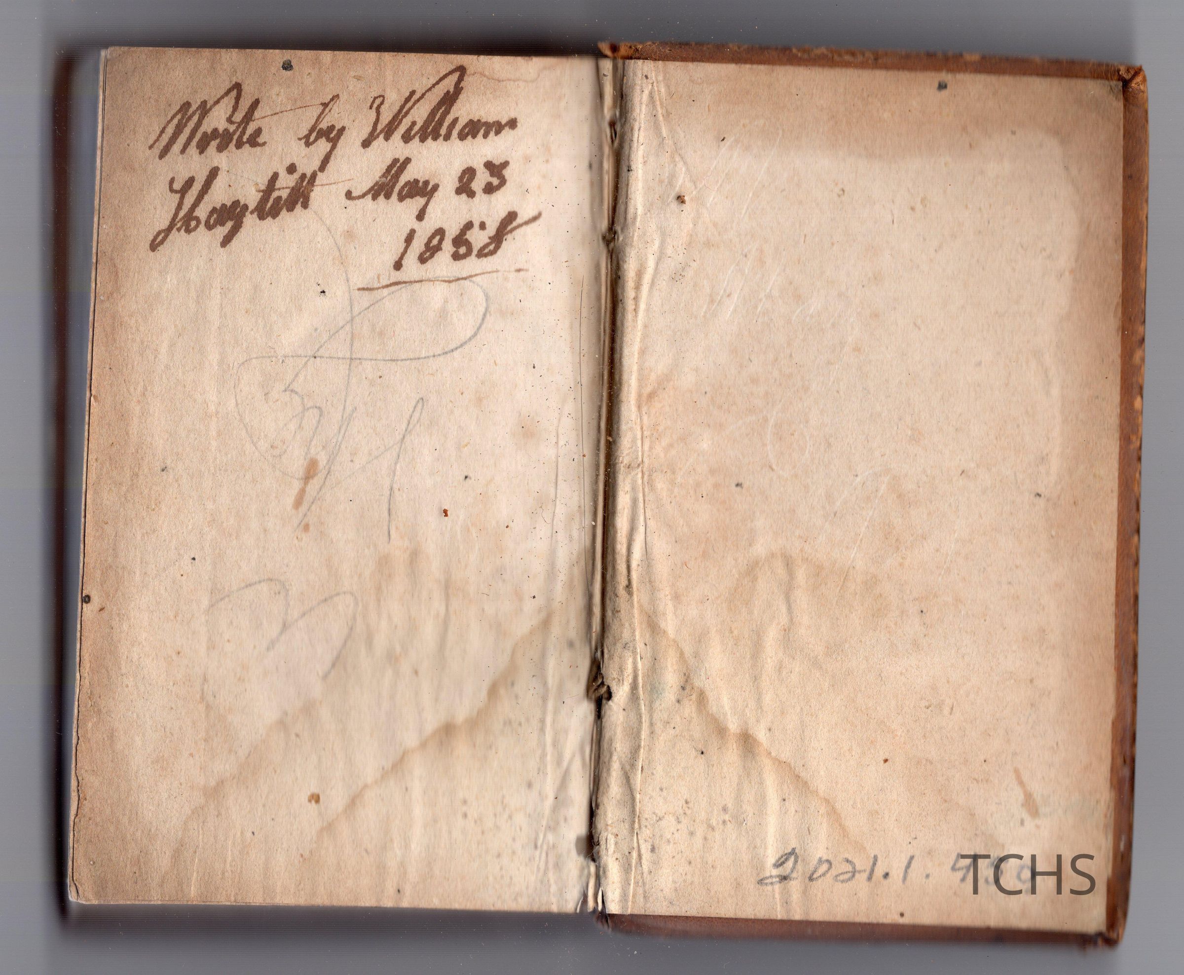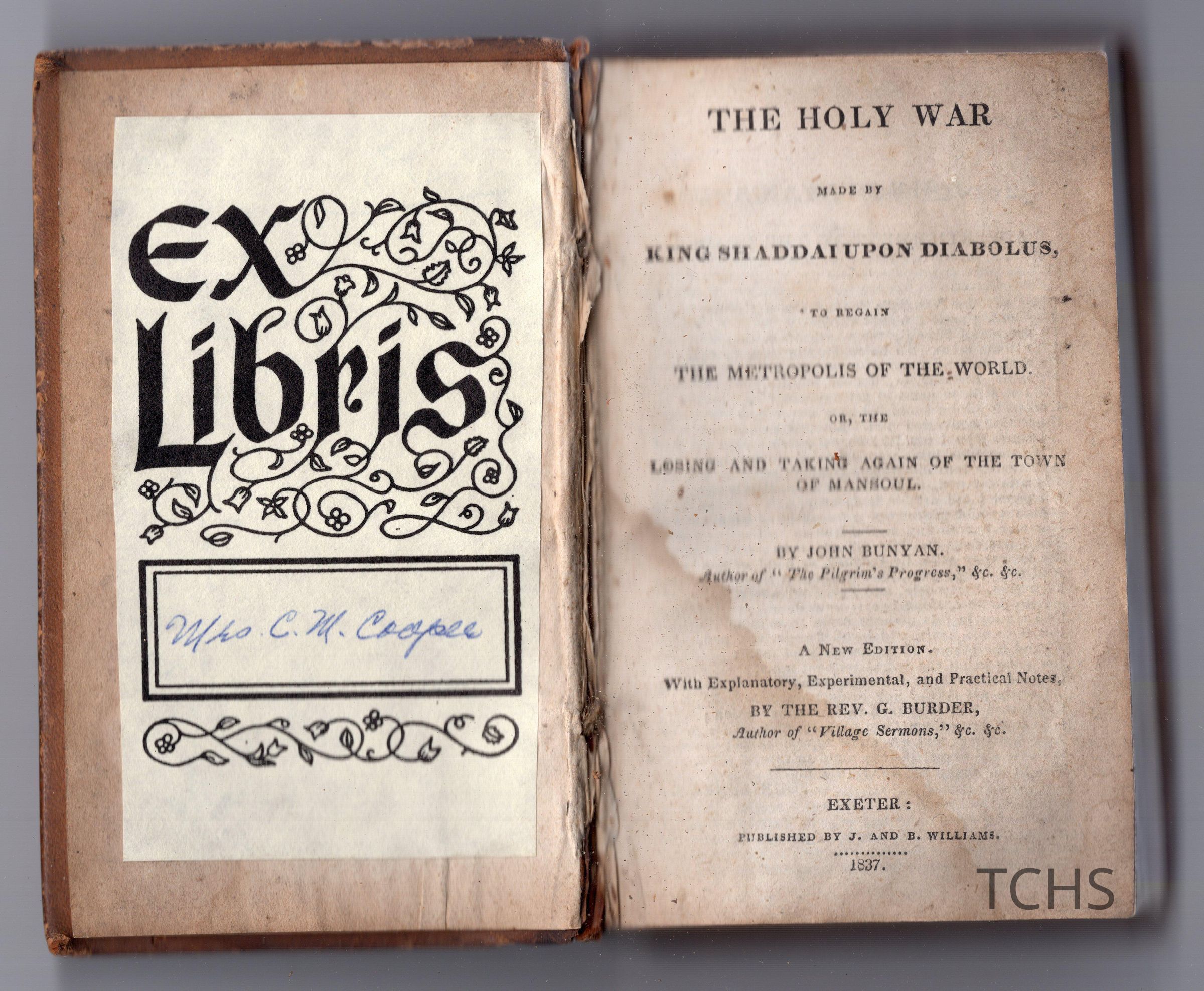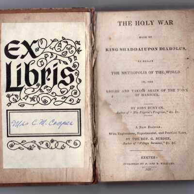 "The Holy War made by King Shaddaiupon Diabolus to Begain the Metropolis of the World. or, the Losing and taking again of the Town of Mansoul. By John Bunyan". "Ex Libris" paper glued to front cover, Mrs. C.M. Coopee written on it. On back cover "Wrote by William Hagtill (Hagtitt?) May 23 1858".Location