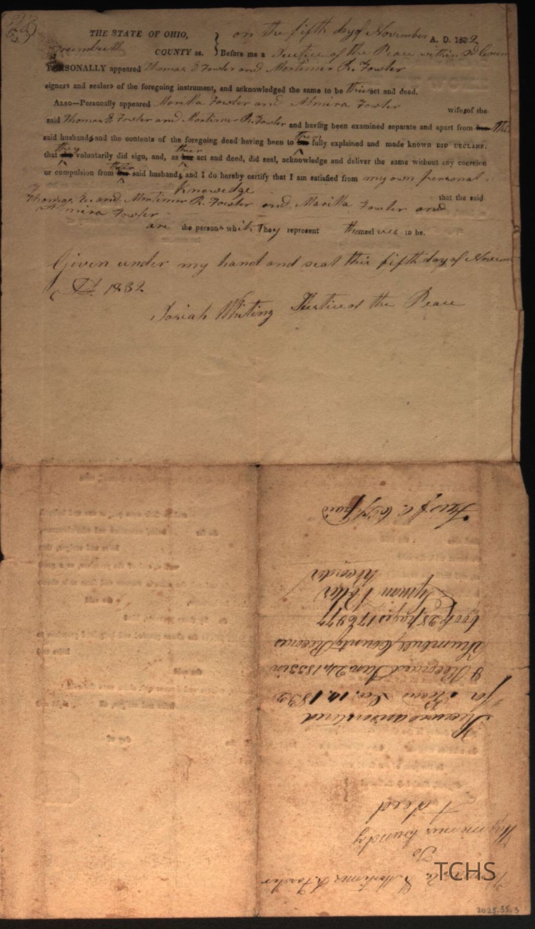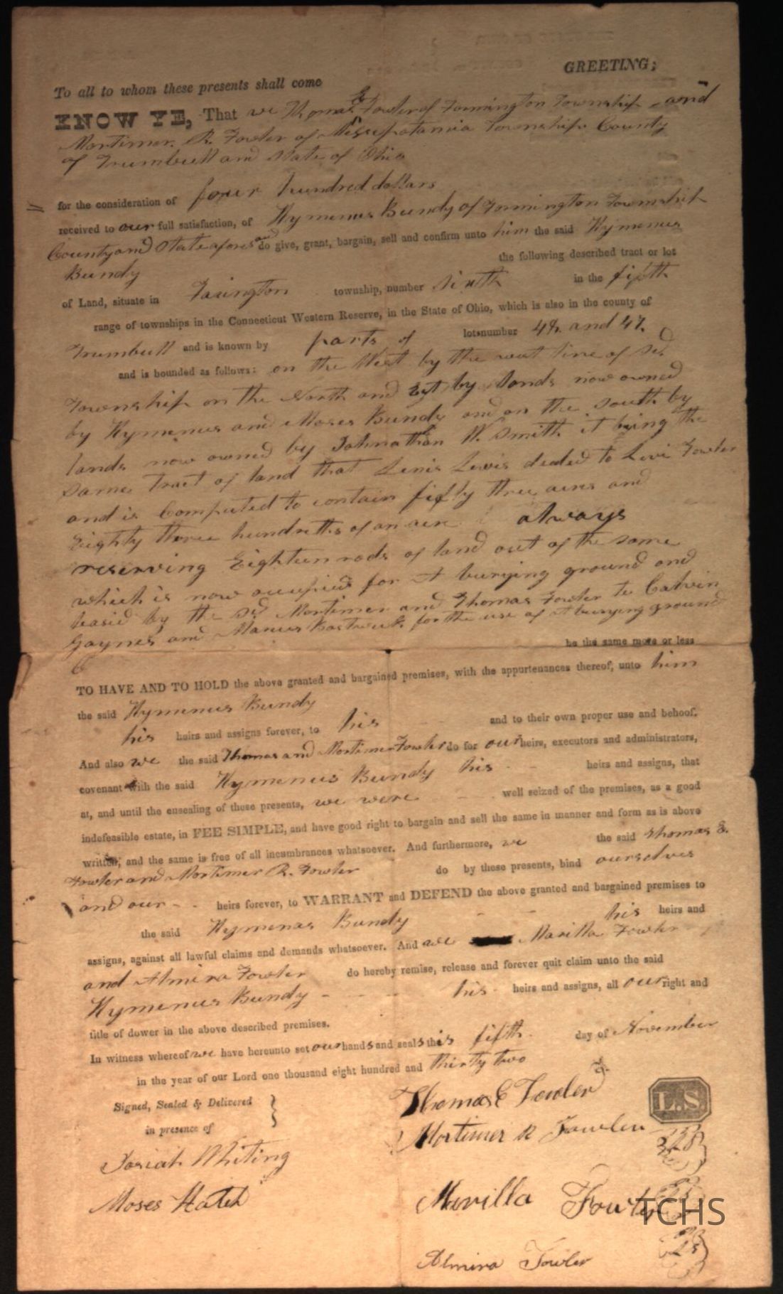 A deed between Thomas E. Fowler and Mortimer R. Fowler to Hymenus Bundy dated 1839.