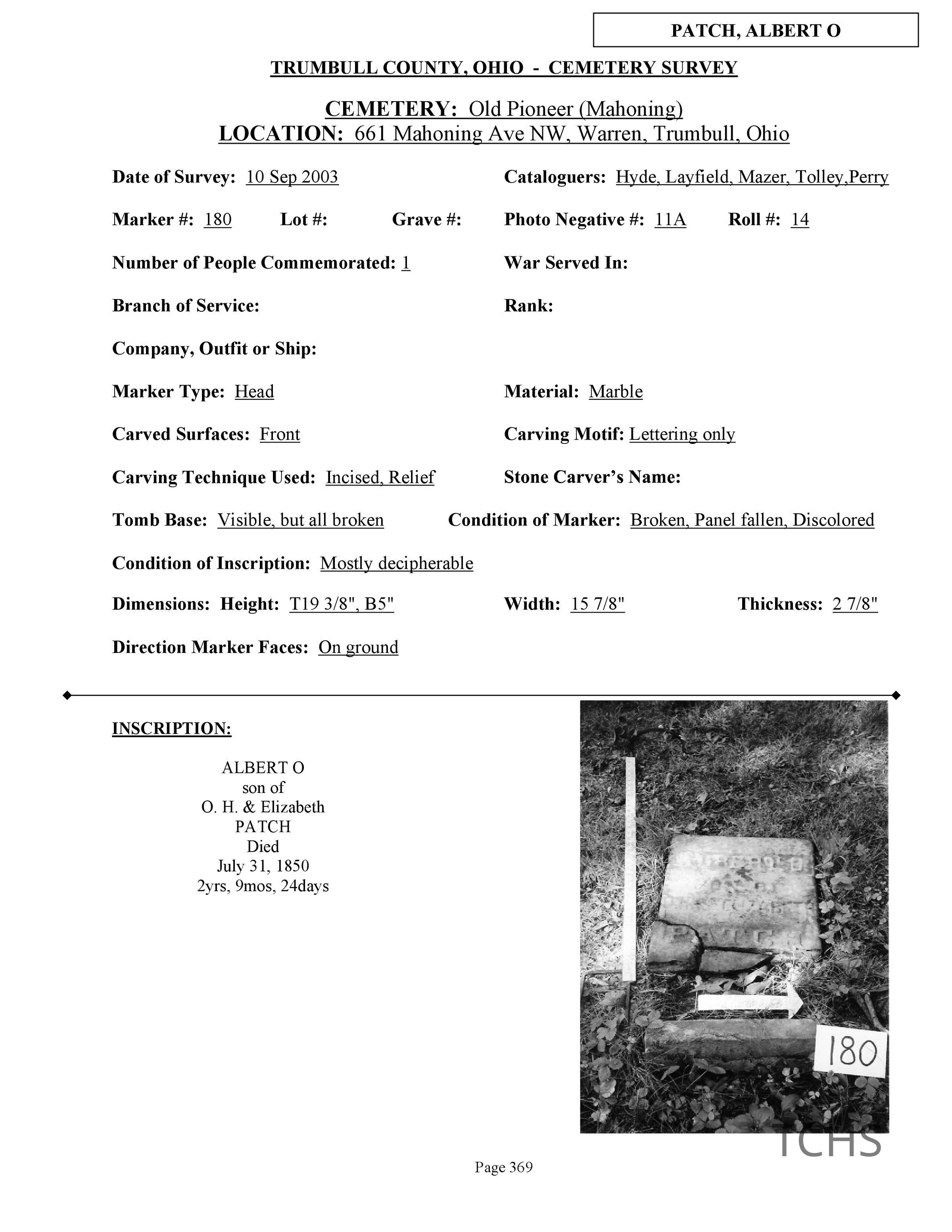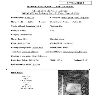 Albert O. Patch died July 31, 1850 at the age of 2 and is buried at the Old Mahoning (Pioneer) Cemetery.