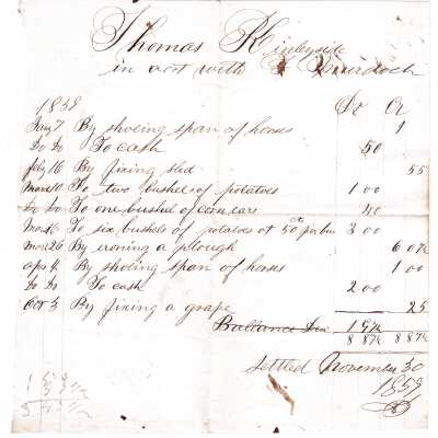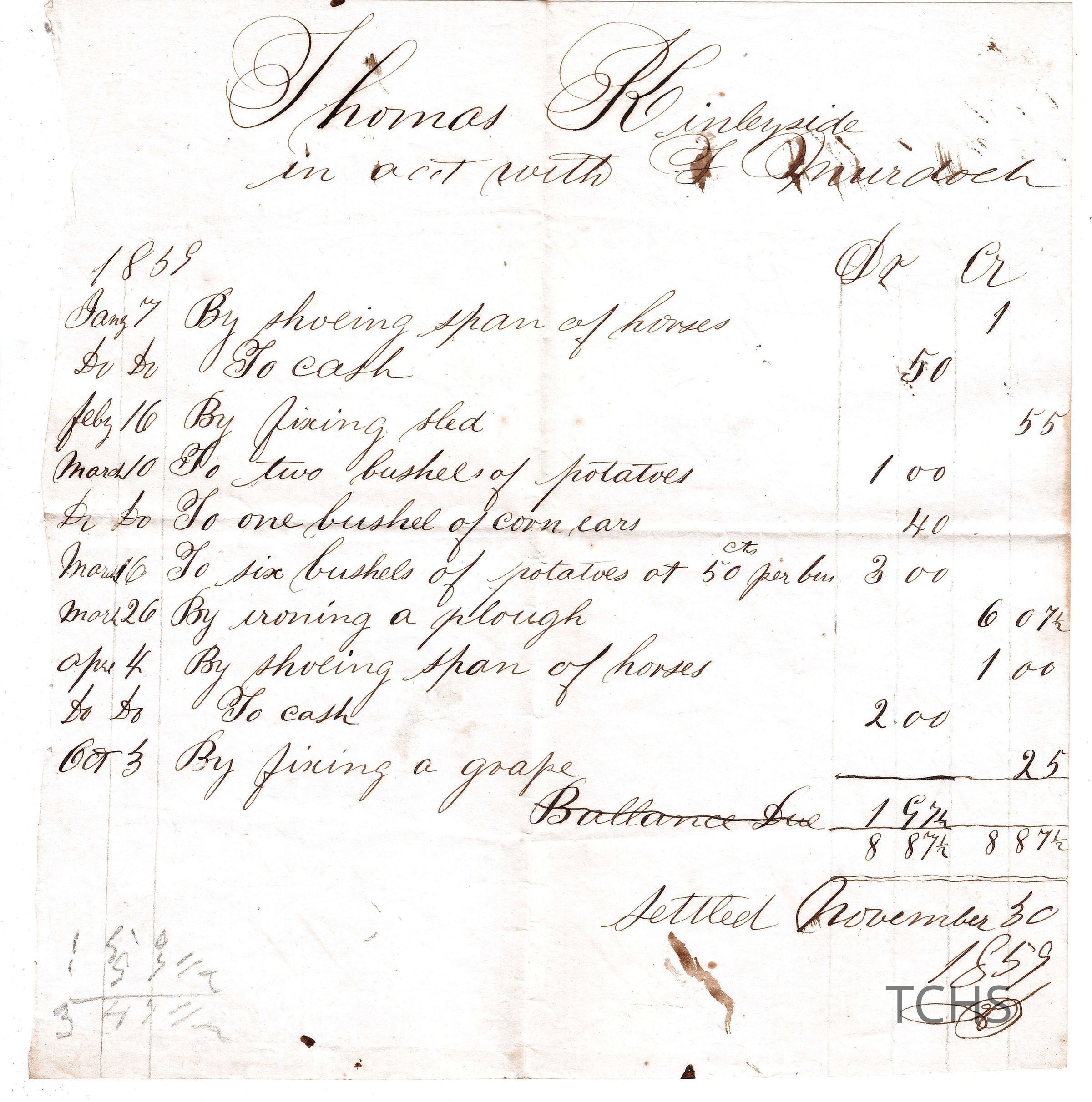 Account page for Thomas Kinleyside in account with F. Murdoch, 1859.