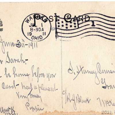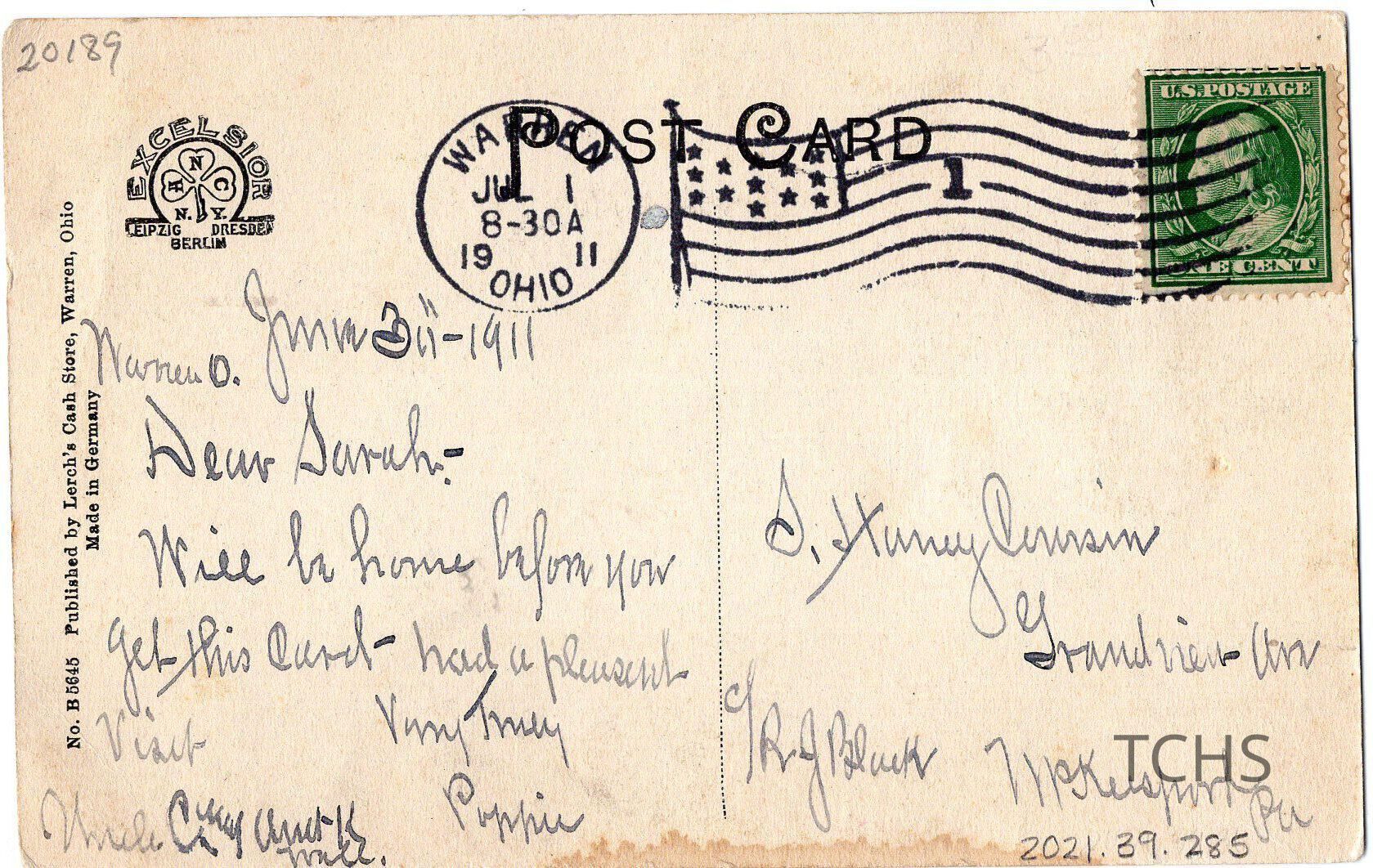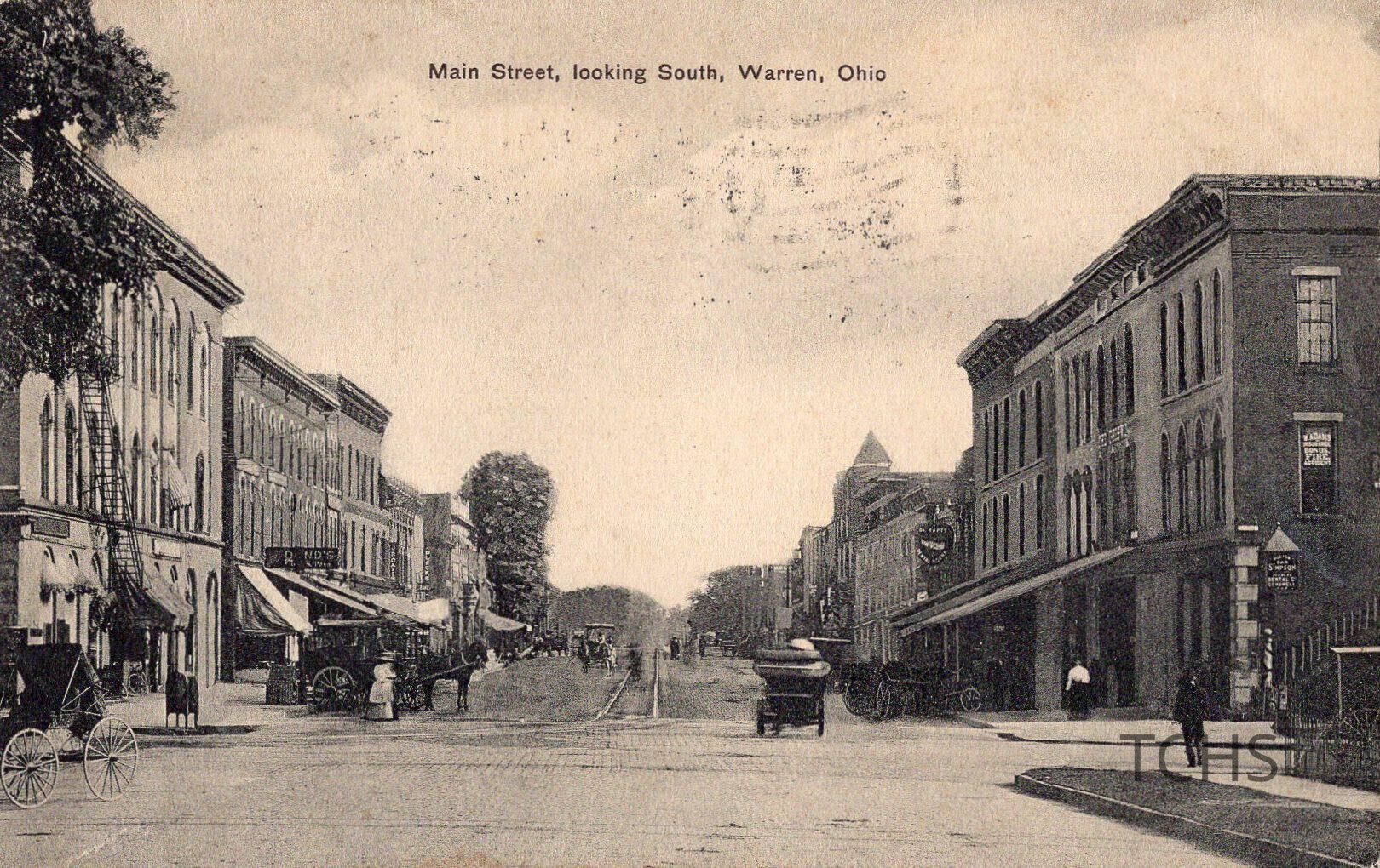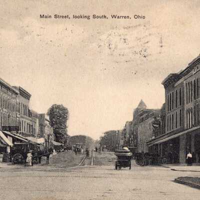 Postcard of Main Street in downtown Warren. To Sarah Cousin(?) from Poppie.