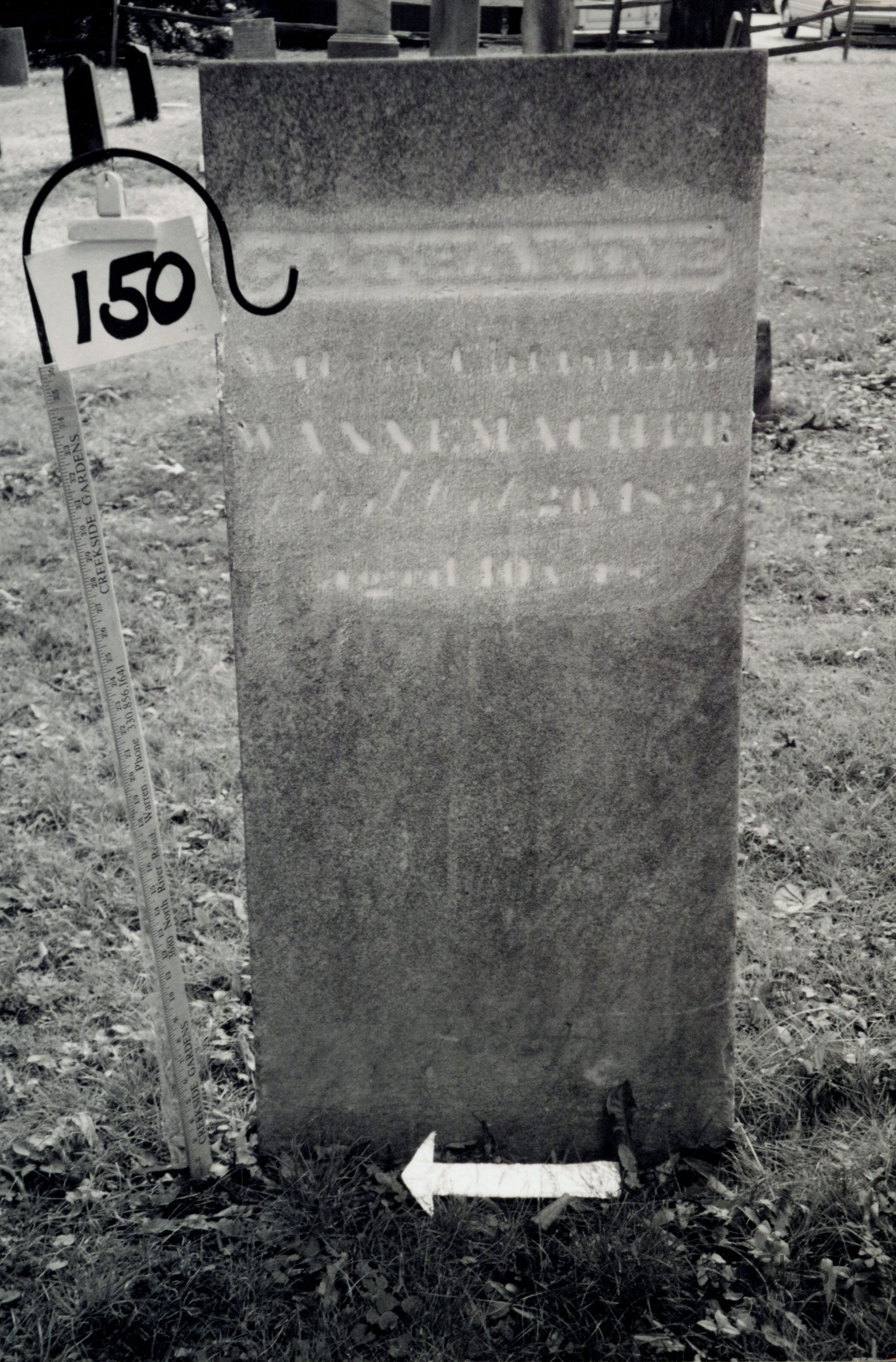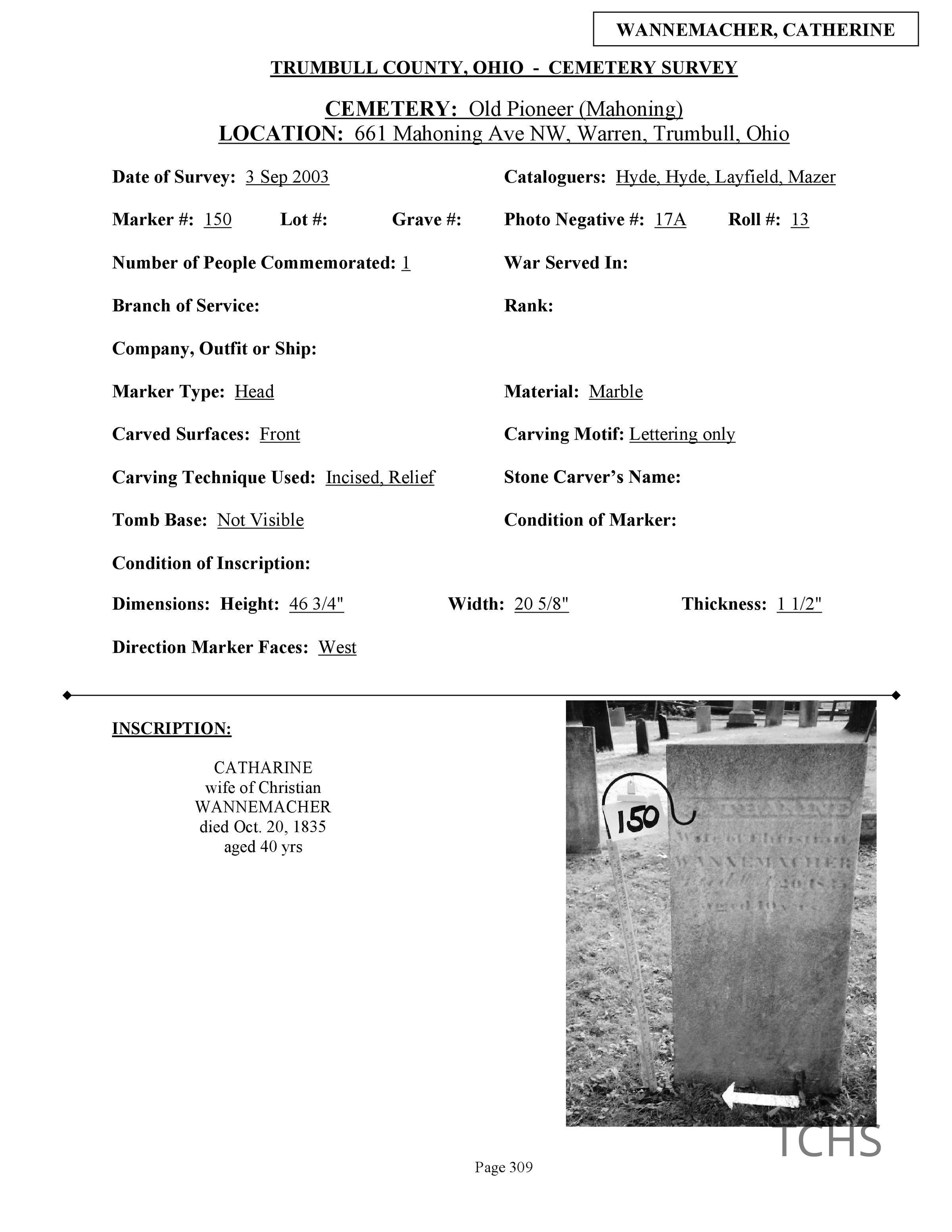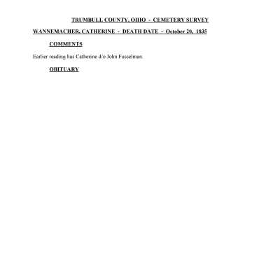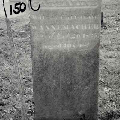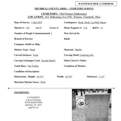 Catherine (Catharine) Wannemacher died October 20, 1835 at the age of 40 and is buried at the Old Mahoning (Pioneer) Cemetery.